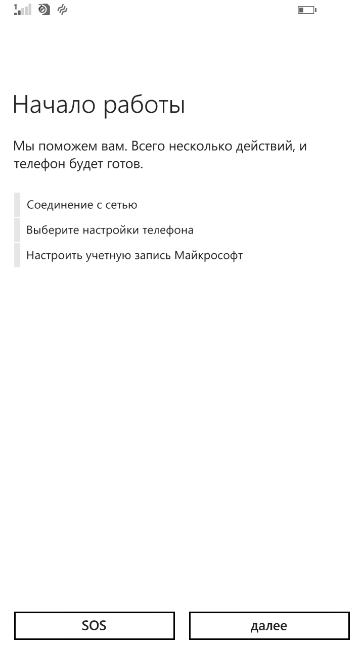 При первоначальной настройке смартфона пользователь выбирает язык интерфейса (русский и английский в списке присутствуют), настраивает подключение к беспроводной сети, и указывает свой аккаунт Microsoft. Если ранее он был использован с другим аппаратом, может быть предложено восстановление с его резервной копии.