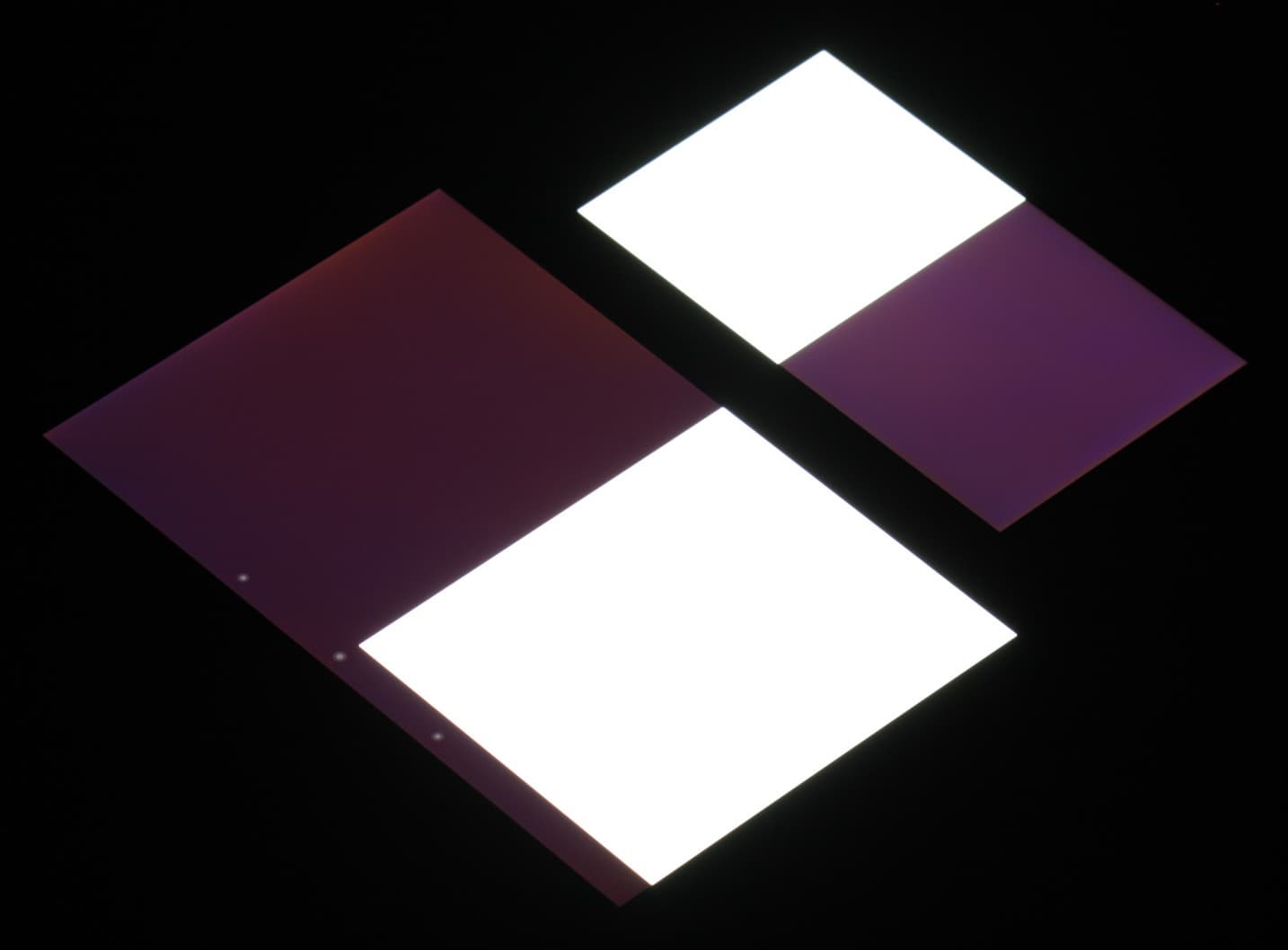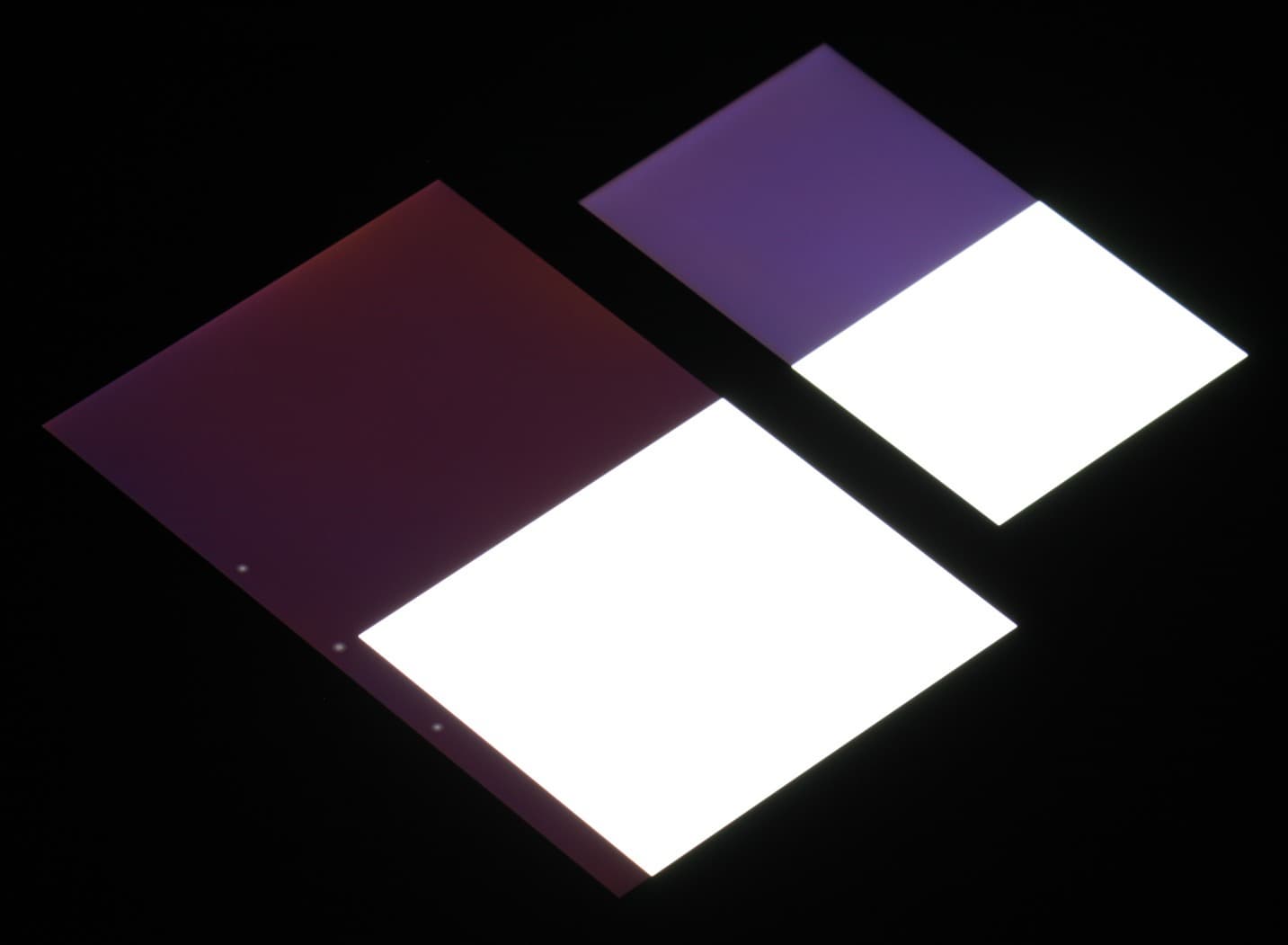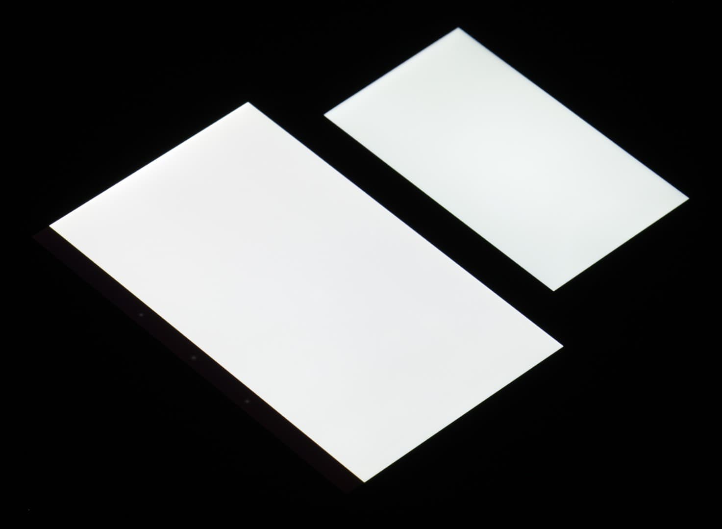 Яркость под углом у экранов уменьшилась (как минимум в 4 раза, исходя из разницы в выдержке), и уменьшилась в равной степени. Черное поле при отклонении по диагонали высветляется не очень сильно (но сильнее, чем у Nexus 7) и приобретает фиолетовый или красно-фиолетовый оттенок. Фотографии ниже это демонстрируют (яркость белых участков в перпендикулярном плоскости экранов направлении одинаковая!):