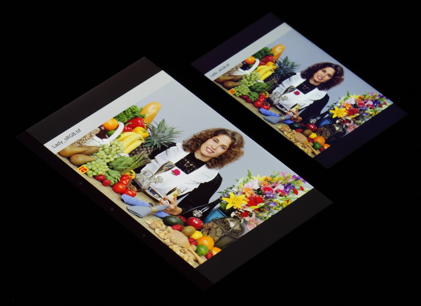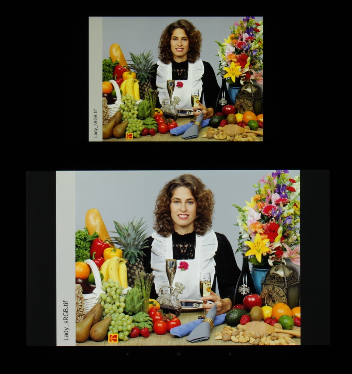 Однако координаты первичных цветов не очень сильно отклоняются от вершин треугольника sRGB, в итоге цвета имеют естественную насыщенность. Баланс оттенков на шкале серого хороший, так как цветовая температура близка к стандартным 6500 К, и отклонение от спектра абсолютно черного тела (ΔE) меньше 10, что для потребительского устройства считается приемлемым показателем. При этом цветовая температура и ΔE мало изменяются от оттенка к оттенку — это положительно сказывается на визуальной оценке цветового баланса. (Самые темные области шкалы серого можно не учитывать, так как там баланс цветов не имеет большого значения, да и погрешность измерений цветовых характеристик на низкой яркости большая.)