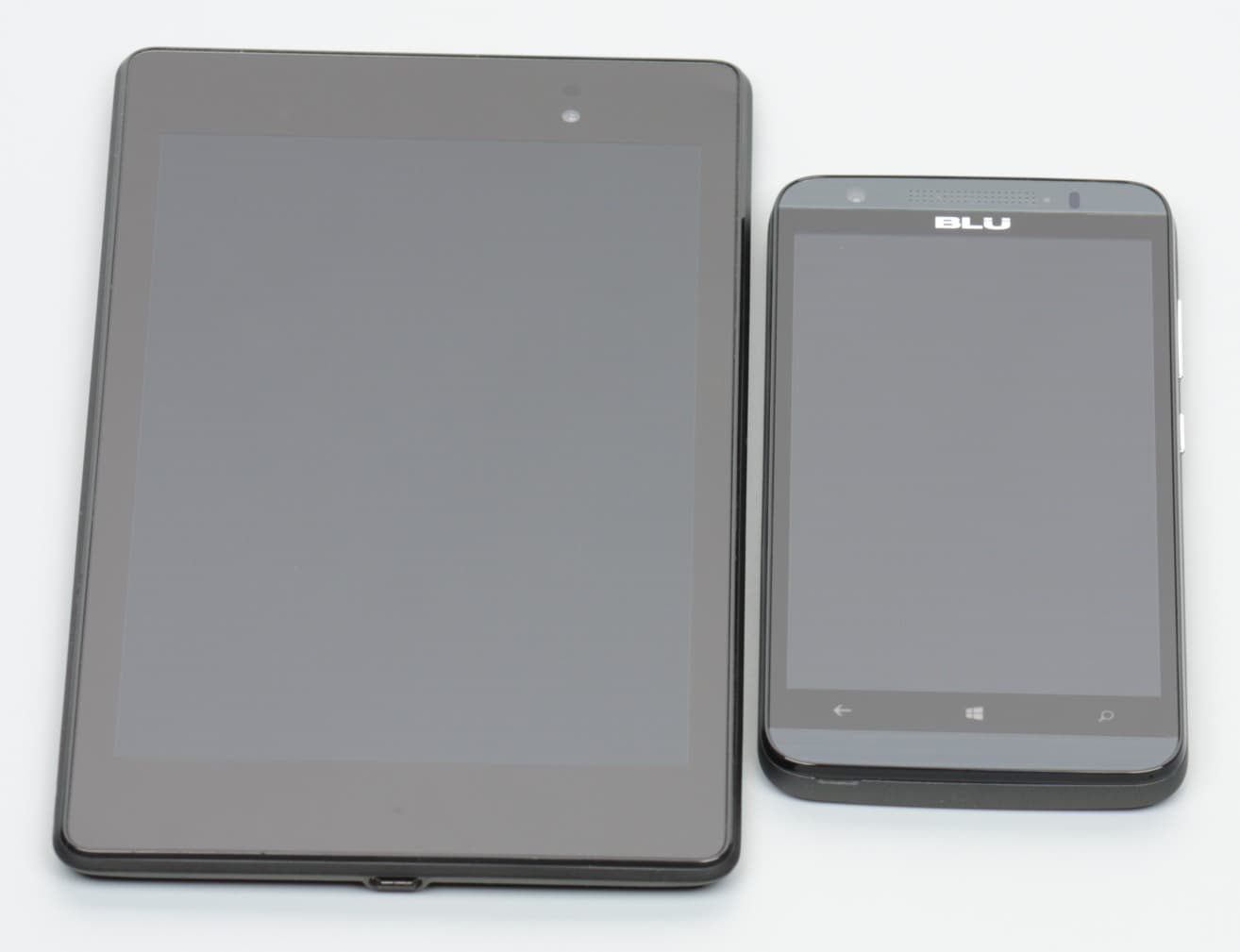 Лицевая поверхность экрана выполнена в виде стеклянной пластины с зеркально-гладкой поверхностью, устойчивой к появлению царапин. Судя по отражению объектов антибликовые свойства экрана не хуже, чем у экрана Google Nexus 7 (2013) (далее просто Nexus 7). Для наглядности приведем фотографию, на которой в выключенных экранах отражается белая поверхность (слева — Nexus 7, справа — Blu Win HD LTE, далее их можно различать по размеру):