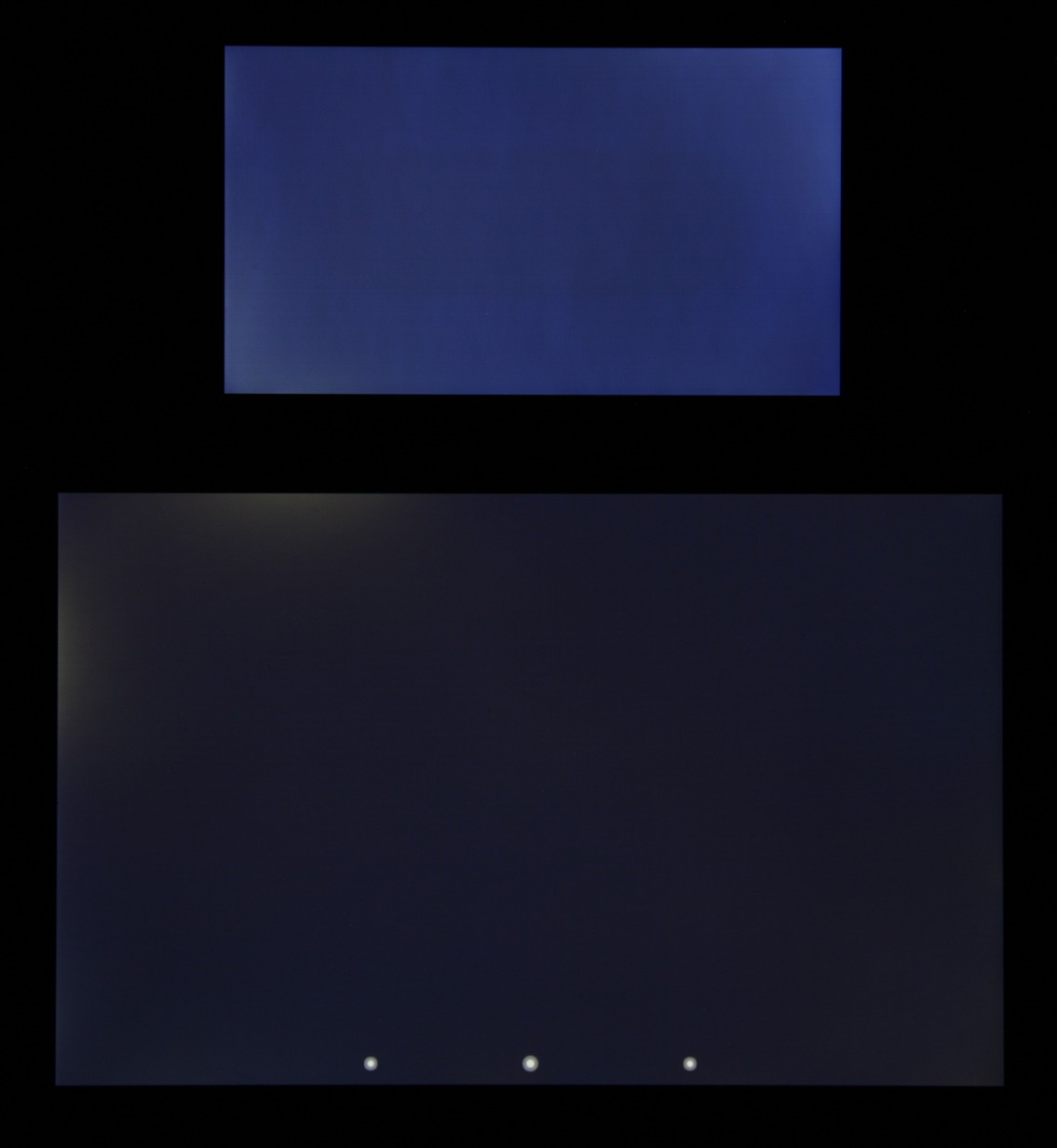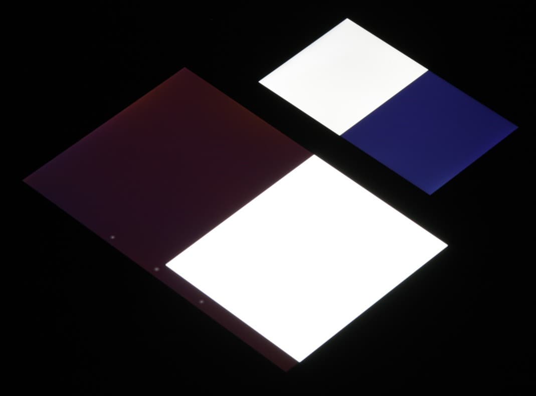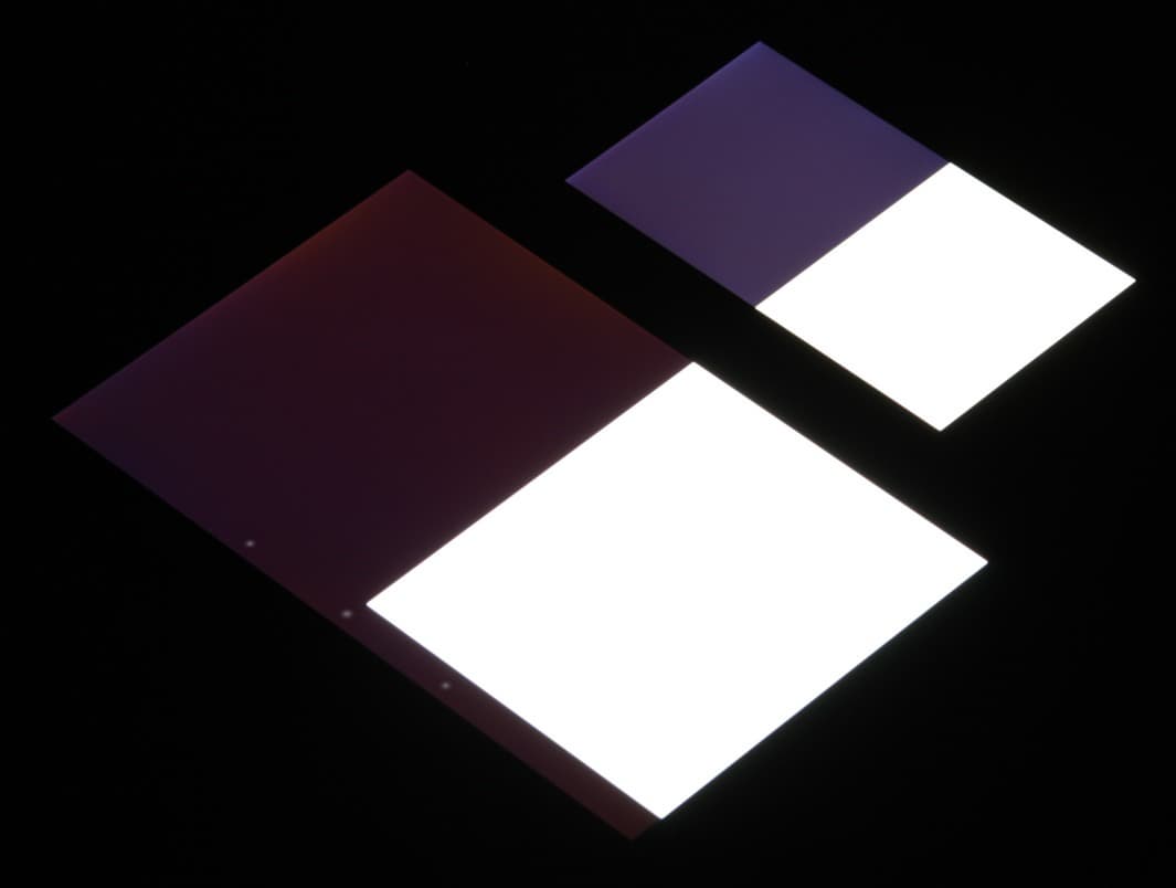 Яркость под углом у экранов уменьшилась (как минимум в 5 раз, исходя из разницы в выдержке), но у BQ Aquaris E4.5 экран заметно темнее. Черное поле при отклонении по диагонали высветляется сильно и приобретает фиолетовый или красно-фиолетовый оттенок. Фотографии ниже это демонстрируют (яркость белых участков в перпендикулярном плоскости экранов направлении одинаковая!):