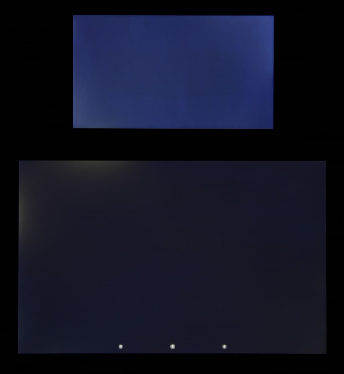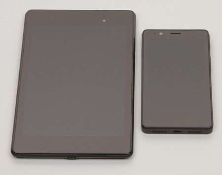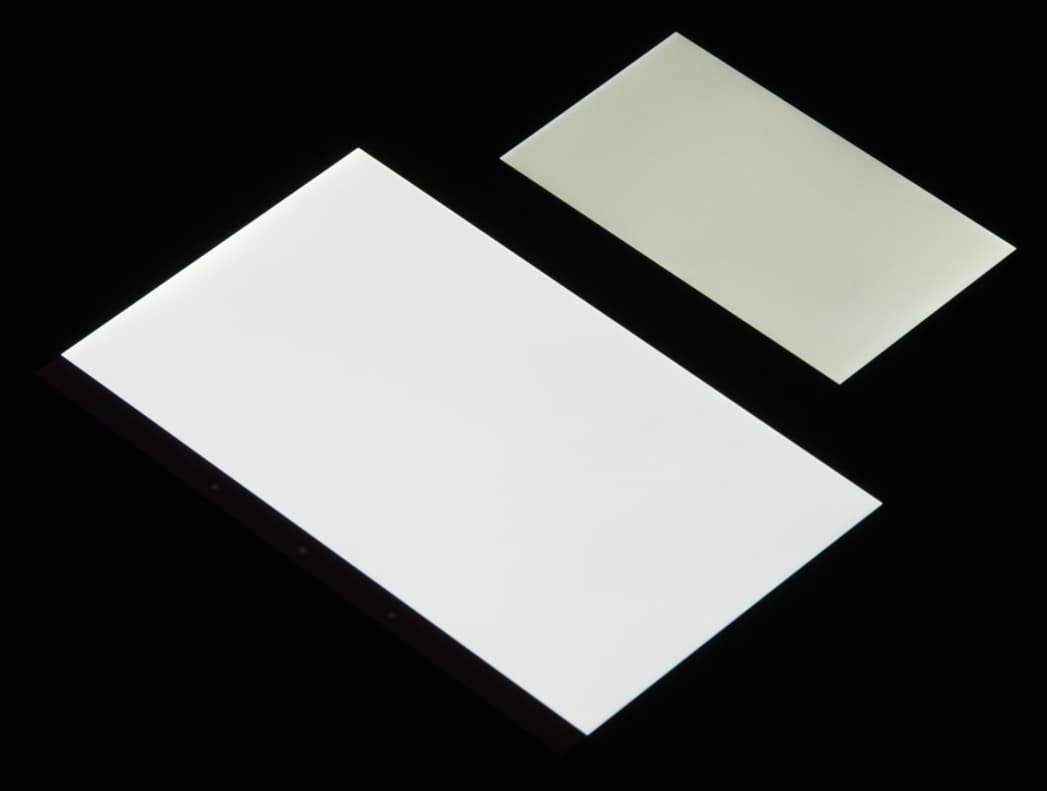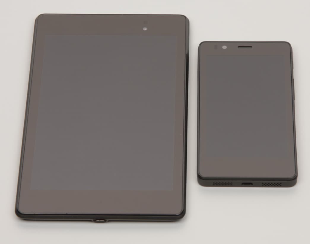 Лицевая поверхность экрана выполнена в виде стеклянной пластины с зеркально-гладкой поверхностью, устойчивой к появлению царапин. Судя по отражению объектов антибликовые свойства экрана не хуже, чем у экрана Google Nexus 7 (2013) (далее просто Nexus 7). Для наглядности приведем фотографию, на которой в выключенных экранах отражается белая поверхность (слева — Nexus 7, справа — BQ Aquaris E4.5, далее их можно различать по размеру):
