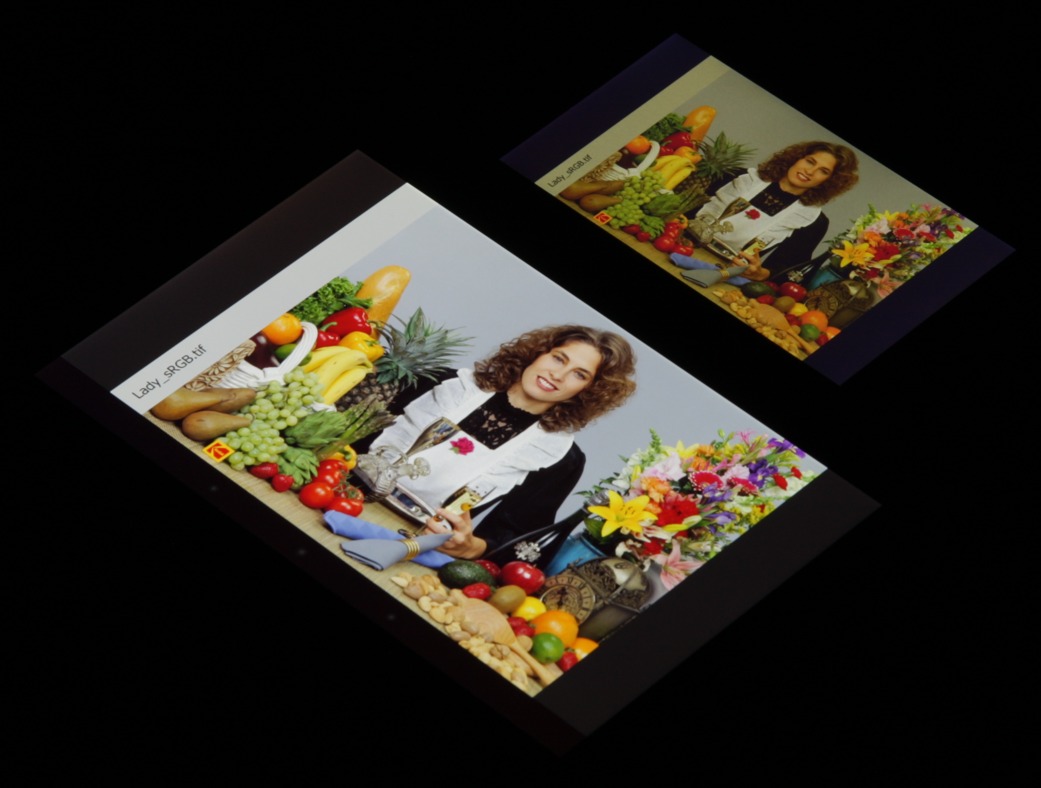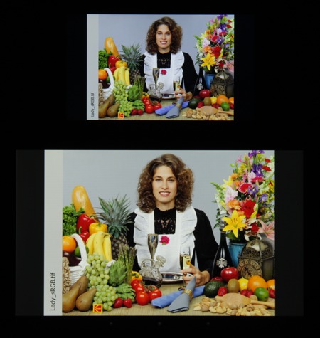 В итоге цвета имеют естественную насыщенность. Баланс оттенков на шкале серого слегка компромиссный, так как цветовая температура сильно выше стандартных 6500 К, но отклонение от спектра абсолютно черного тела (ΔE) все же меньше 10, что для потребительского устройства считается приемлемым показателем. При этом цветовая температура и ΔE умеренно изменяются от оттенка к оттенку — это положительно сказывается на визуальной оценке цветового баланса. (Самые темные области шкалы серого можно не учитывать, так как там баланс цветов не имеет большого значения, да и погрешность измерений цветовых характеристик на низкой яркости большая.)