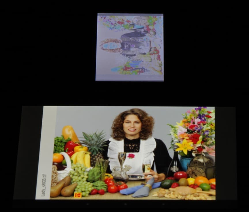 Экран имеет не самые плохие углы обзора в горизонтальном направлении, но при малейшем отклонении вверх инвертируются темные оттенки, при отклонении вниз — светлые. Для сравнения приведем фотографии, на которых на экраны Nexus 7 и тестируемого устройства выведены одинаковые изображения, при этом яркость обоих экранов установлена примерно на 200 кд/м², а цветовой баланс на фотоаппарате принудительно переключен на 6500 К. Перпендикулярно к экранам тестовая картинка: