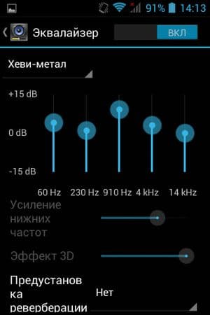 Звучание разговорного динамика не очень комфортное для слуха: звук глухой, с металлическим налетом, звучит приглушенно даже на максимальном уровне громкости. Хотя, голос знакомого собеседника, тембр и интонацию узнать и разобрать вполне можно. Из настроек — стандартные возможности эквалайзера с предустановленными значениями штатного плеера Android.