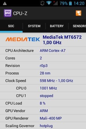 - SoC MediaTek MT6572, 1,0 ГГц, 2 ядра, ARM Cortex-A7