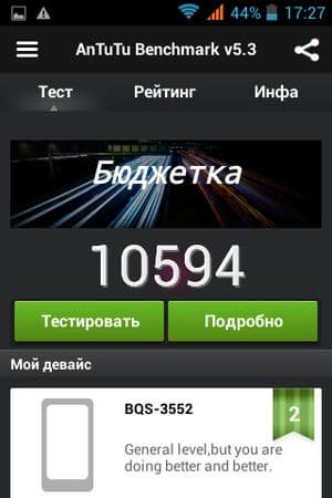 Что касается конкретных цифр в бенчмарках, то по результатам популярного AnTuTu производительность у аппаратной начинки героя обзора оказалась настолько низкой, что аналогов среди ранее протестированных по единой методике мобильных устройств не нашлось. Правда, никто из них и не обладает столь малым объемом оперативной памяти, и это вполне очевидно сказывается самым плачевным образом на общей производительности в тестах. Из-за малого количества выделенной памяти смартфон частично не смог осились или целиком не справился с некоторыми нашими стандартными тестами, такими как EpicCitadel, 3DMark и собственным браузерным Google Octane.
