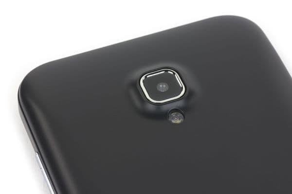 На внешней стороне задней части смартфона врезано квадратное, обрамленное колечком окошко основной камеры. Не смотря на дешевый модуль и достаточно толстый профиль самого корпуса, стекло, тем не менее, еще и выпирает над поверхностью на пару миллиметров. Рядом с ним находится односекционная светодиодная вспышка, для которой не нашлось предустановленного приложения, позволяющего использовать вспышку в качестве фонарика.