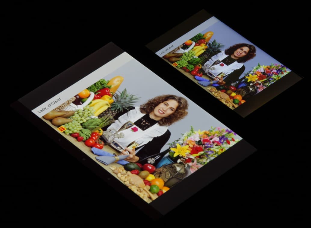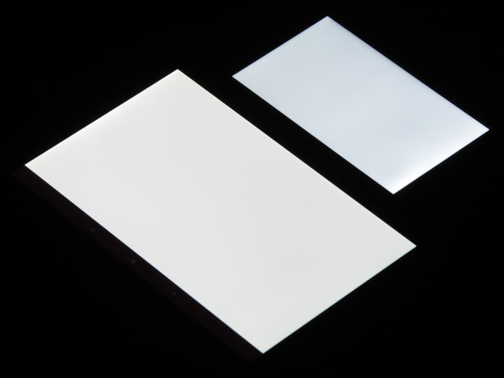 Экран имеет хорошие углы обзора без значительного сдвига цветов даже при больших отклонениях взгляда от перпендикуляра к экрану и без инвертирования (кроме самых-самых темных при отклонении взгляда вправо) оттенков. Для сравнения приведем фотографии, на которой на экраны Nexus 7 и BQ Harvard выведены одинаковые изображения, при этом яркость экранов изначально установлена примерно на 200 кд/м² (по белому полю во весь экран), а цветовой баланс на фотоаппарате принудительно переключен на 6500 К. Перпендикулярно к плоскости экранов белое поле: