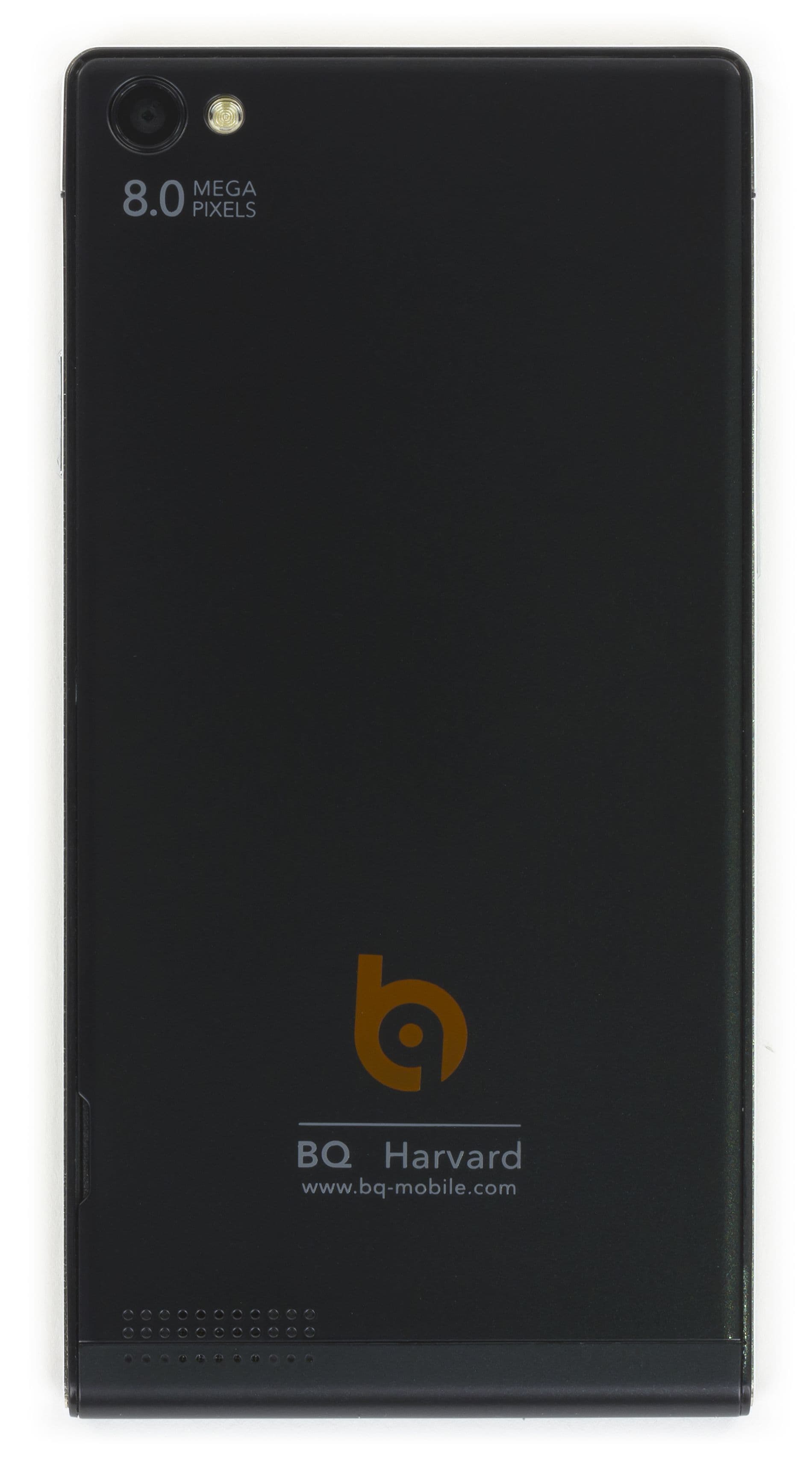 У смартфона имеется металлический широкий плоский ободок, опоясывающий все боковые грани, кроме нижней. Внизу можно обнаружить пластмассовый закругляющийся торец, который и был придуман дизайнерами Huawei для того, чтобы их детище хоть чем-то отличалось от популярного в то время Apple iPhone 4. Задняя крышка и нижнее закругление выполнены из твердого матового пластика без глянца, нет хромированного блеска и у матовой поверхности металлического ободка, так что смартфон в целом можно охарактеризовать как немаркий и нескользкий. В руке аппарат располагается вполне комфортно за счет небольших толщины и массы устройства, ширина корпуса позволяет удобно обхватывать его пальцами. Смартфон BQ Harvard нельзя назвать крупным, его габариты подходят для карманов любых размеров.
