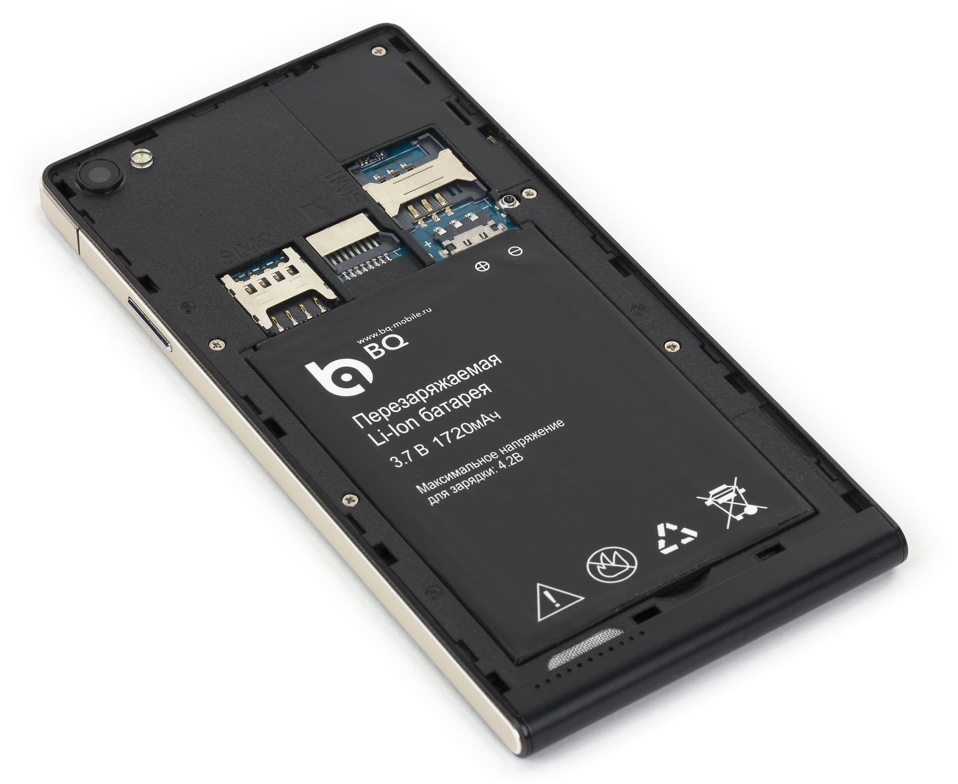 В отличие от аппарата Huawei, здесь не стали мудрить с щелевыми боковыми слотами для карточек, а разместили их под съемной крышкой, как и подобает устройствам бюджетного уровня. Крышка снимается достаточно легко, для зацепления ногтем в ней имеется едва заметный уступ. Под крышкой скрывается съемная батарея и два разнокалиберных слота для SIM-карт форматов Mini-SIM и Micro-SIM. Карты памяти здесь тоже поддерживаются, соответствующий слот располагается посередине между SIM-картами. Все карточки подпираются снизу батареей, так что горячая их замена невозможна.