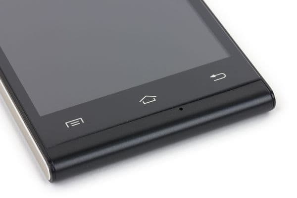 Ниже под экраном оставлено пространство для аппаратных кнопок управления системой и приложениями. Кнопки эти сенсорные, их обозначения нанесены серебристой краской, и они, к сожалению, не имеют вообще никакой подсветки.
