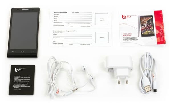 Смартфон BQ Harvard поставляется в продажу в небольшой по размерам коробке из твердого картона с несколькими отделениями внутри. Упаковка не претендует на премиум-уровень: масса разнообразной текстовой информации и картинок делают ее достаточно аляповатой.