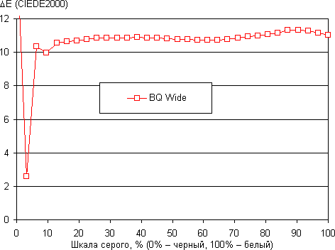В итоге цвета имеют близкую к естественной насыщенность, но, видимо, даже такого отличия в охвате от стандартного хватило, чтобы лица людей стали нездорово желтушными. Баланс оттенков на шкале серого средний, так как цветовая температура выше стандартных 6500 К и отклонение от спектра абсолютно черного тела (ΔE) больше 10 на большинстве оттенков серого, что даже для потребительского устройства считается плохим показателем. При этом цветовая температура и ΔE мало изменяются от оттенка к оттенку — это положительно сказывается на визуальной оценке цветового баланса. (Самые темные области шкалы серого можно не учитывать, так как там баланс цветов не имеет большого значения, да и погрешность измерений цветовых характеристик на низкой яркости большая.)