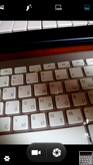 В смартфоне использовано нестандартное приложение для работы с камерой, отличающееся от обычного, встроенного в Android, как интерфейсом, так и функциональностью. В верхней части экрана находится переключатель режимов работы камеры — «панорамная съемка», «переключить на красивое лицо» (видимо, по мнению разработчиков приложения, это самое удачное название функции автофокусировки на лицах, которая, кстати, работает довольно хорошо), HDR и обычный режим фото. В нижней части — переключатель между фронтальной и тыльной камерами, иконка-миниатюра для доступа к отснятому материалу, значок вызова меню настроек и две большие отдельные кнопки для съемки фото и видео. Последнее решение очень удобно: у пользователя нет необходимости переключать режим камеры между фото и видео, ему достаточно лишь нажать нужную кнопку спуска. Еще одной приятной особенностью приложения является возможность перейти к просмотру отснятого материала горизонтальным «свайпом» — как в iOS.