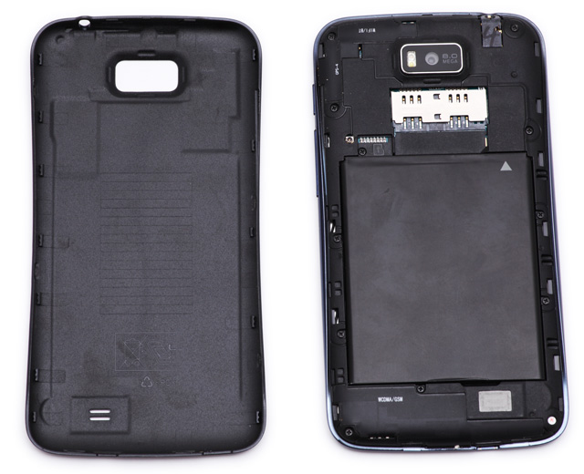 Под ней также все стандартно — отсек для батареи, слот для карты microSD и два слота для SIM-карт. Для установки любой карты необходимо извлечь батарею, поэтому «горячая» замена флэш-карты невозможна. Карту 3G (WCDMA) можно установить только в слот SIM 1, в то время как во втором слоте можно использовать лишь SIM-карты GSM. Это вызывает некоторое удивление, так как MediaTek рекламирует свою новую SoC как платформу, способную обслуживать две карты 3G одновременно. Возможно, это особенность конкретной модели смартфона или используемой прошивки.