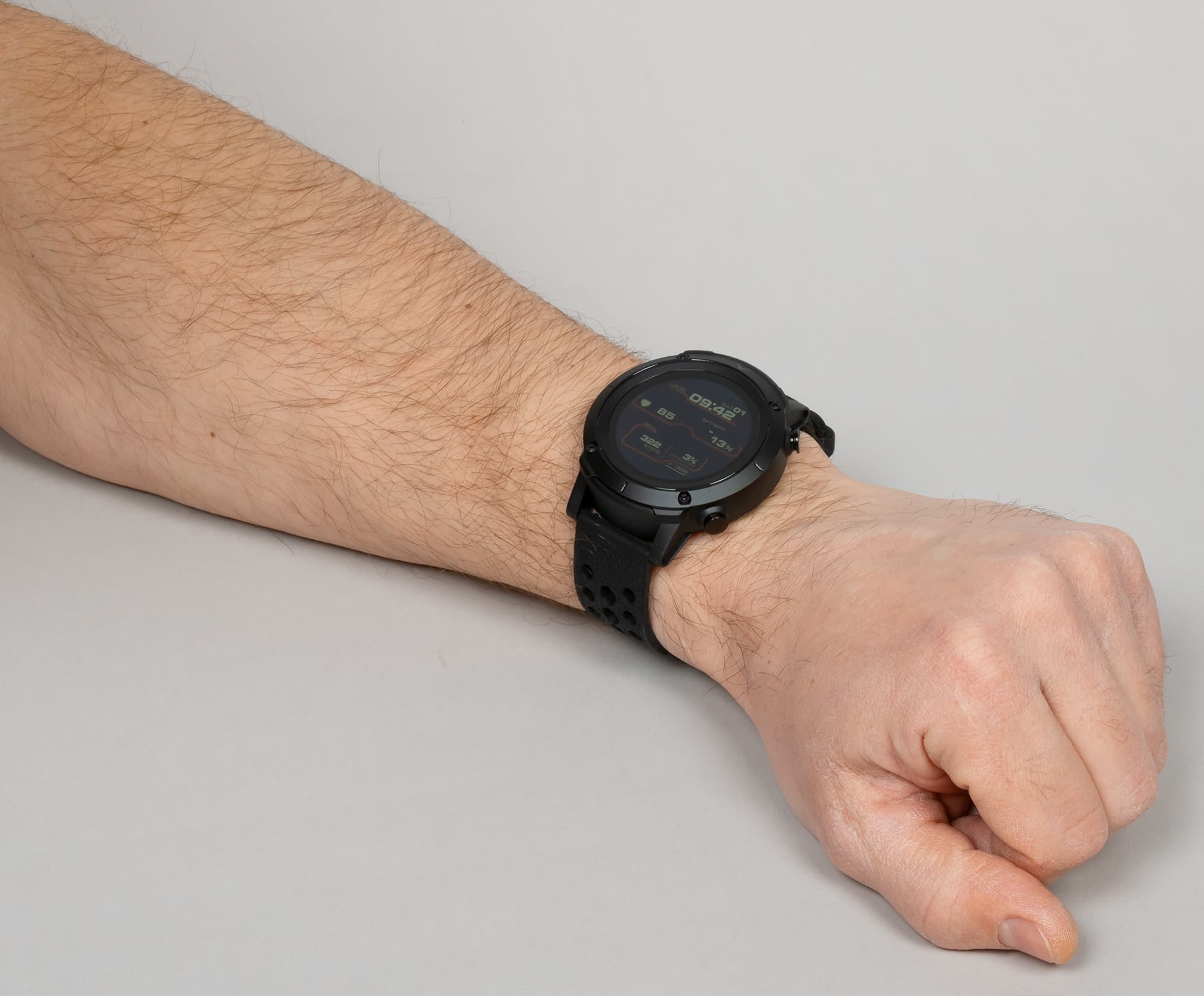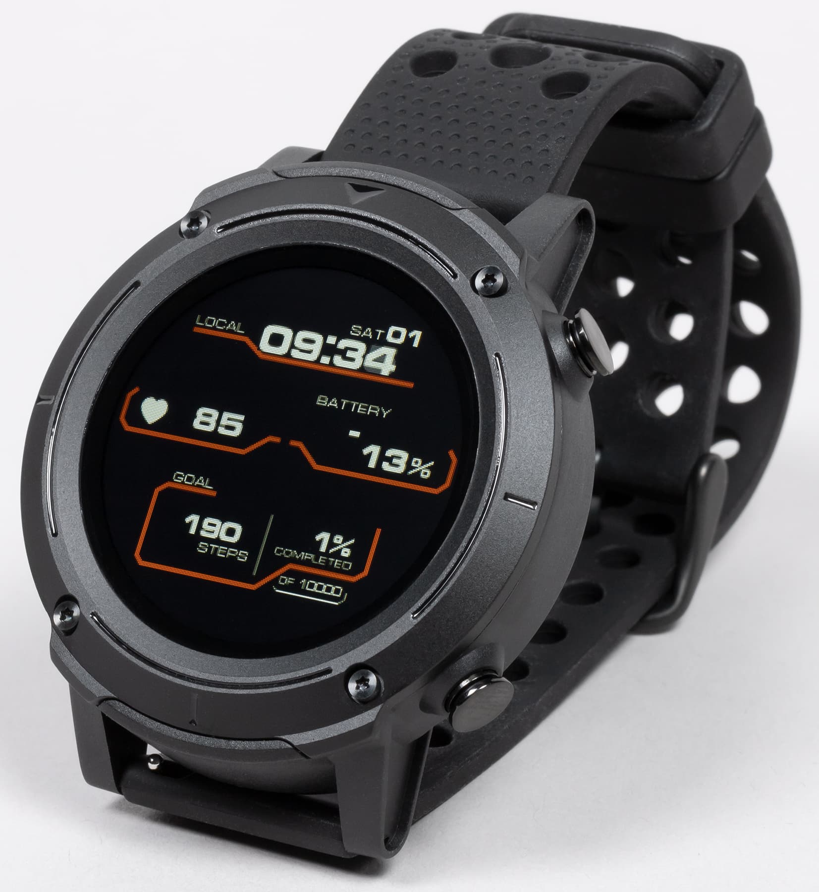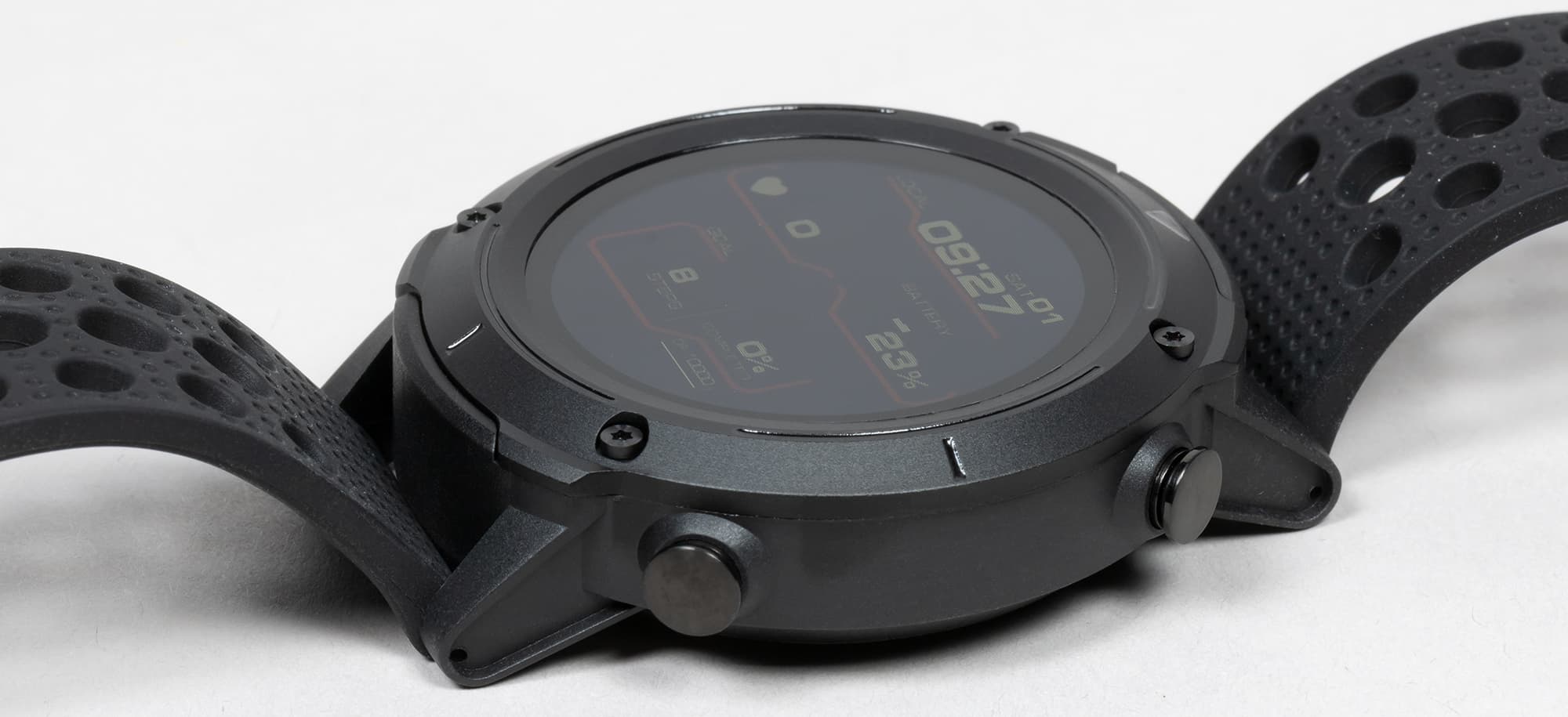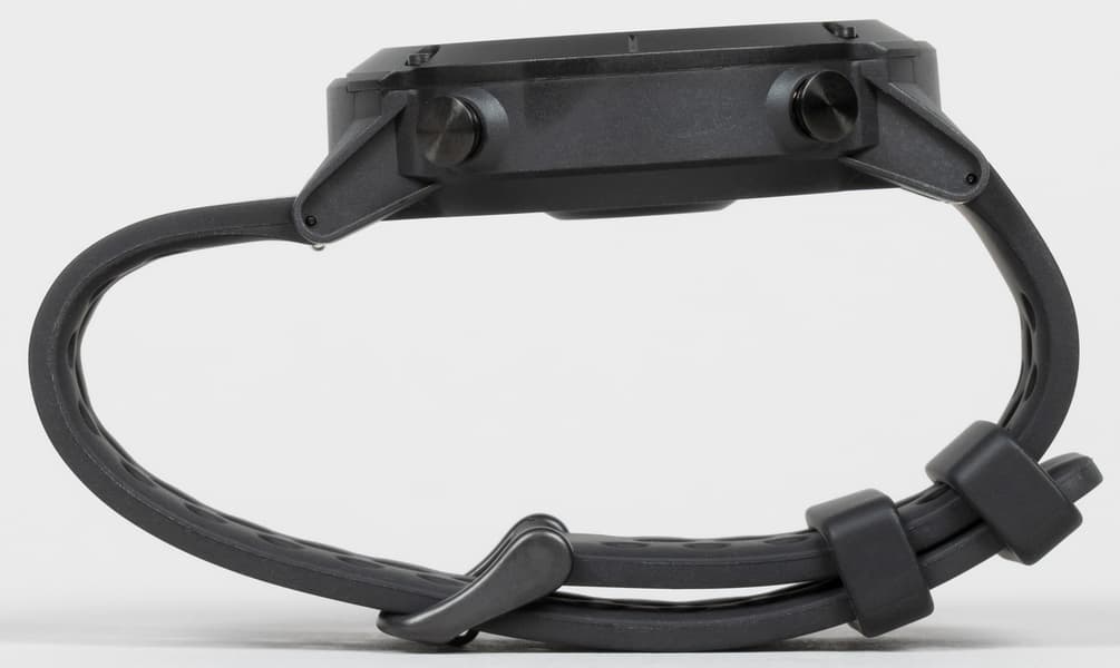 Внешний вид новых часов явно решен в духе брутальных спортивных моделей. Это огромный массивный корпус с металлической окантовкой вокруг дисплея, незамаскированными винтами и двумя физическими кнопками с правой стороны.