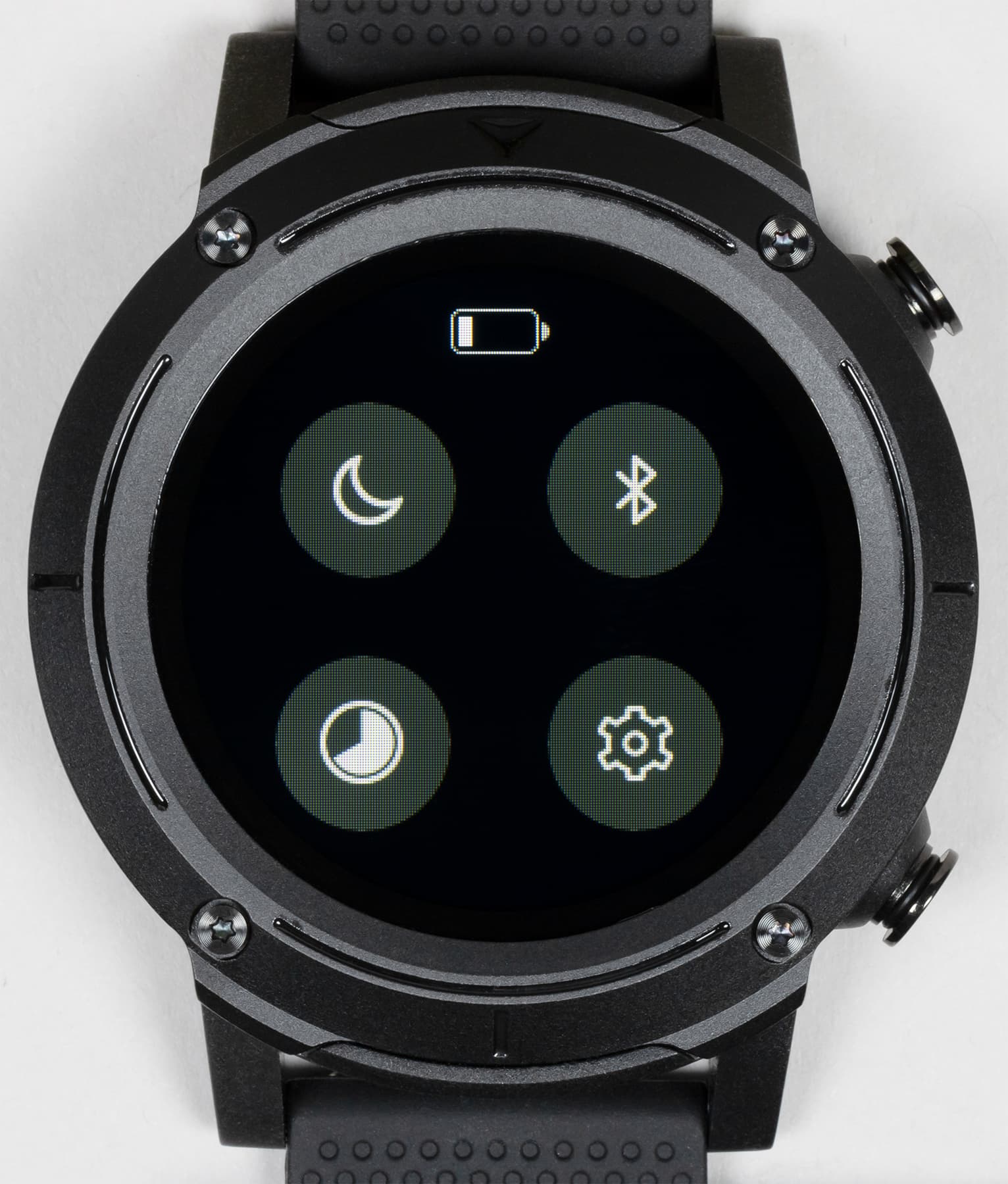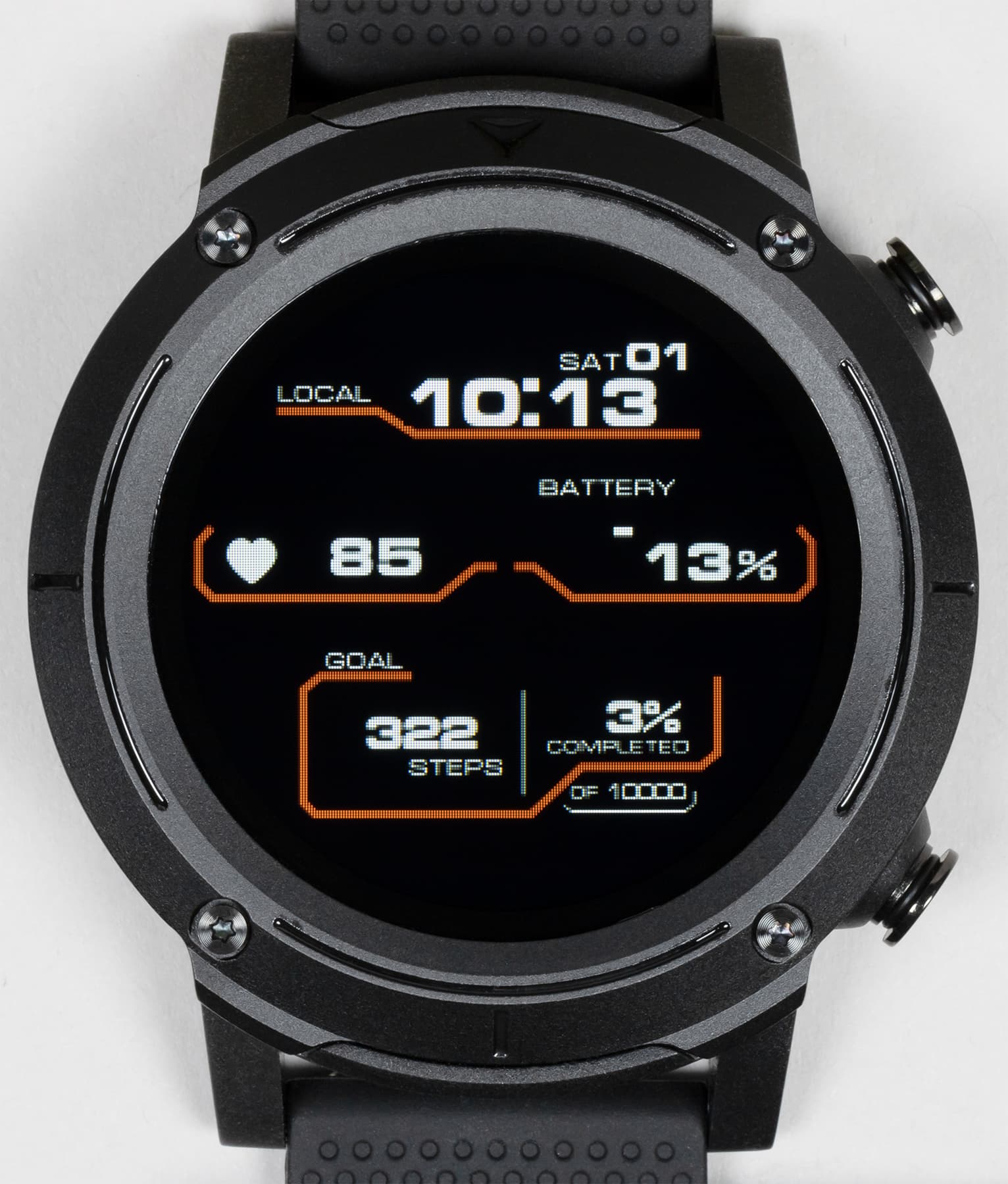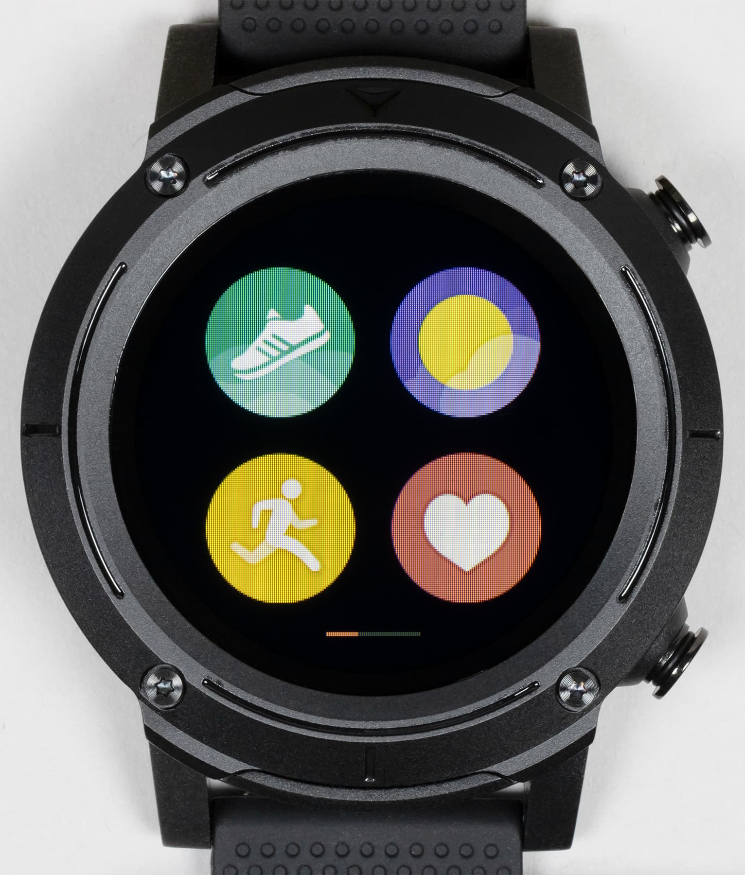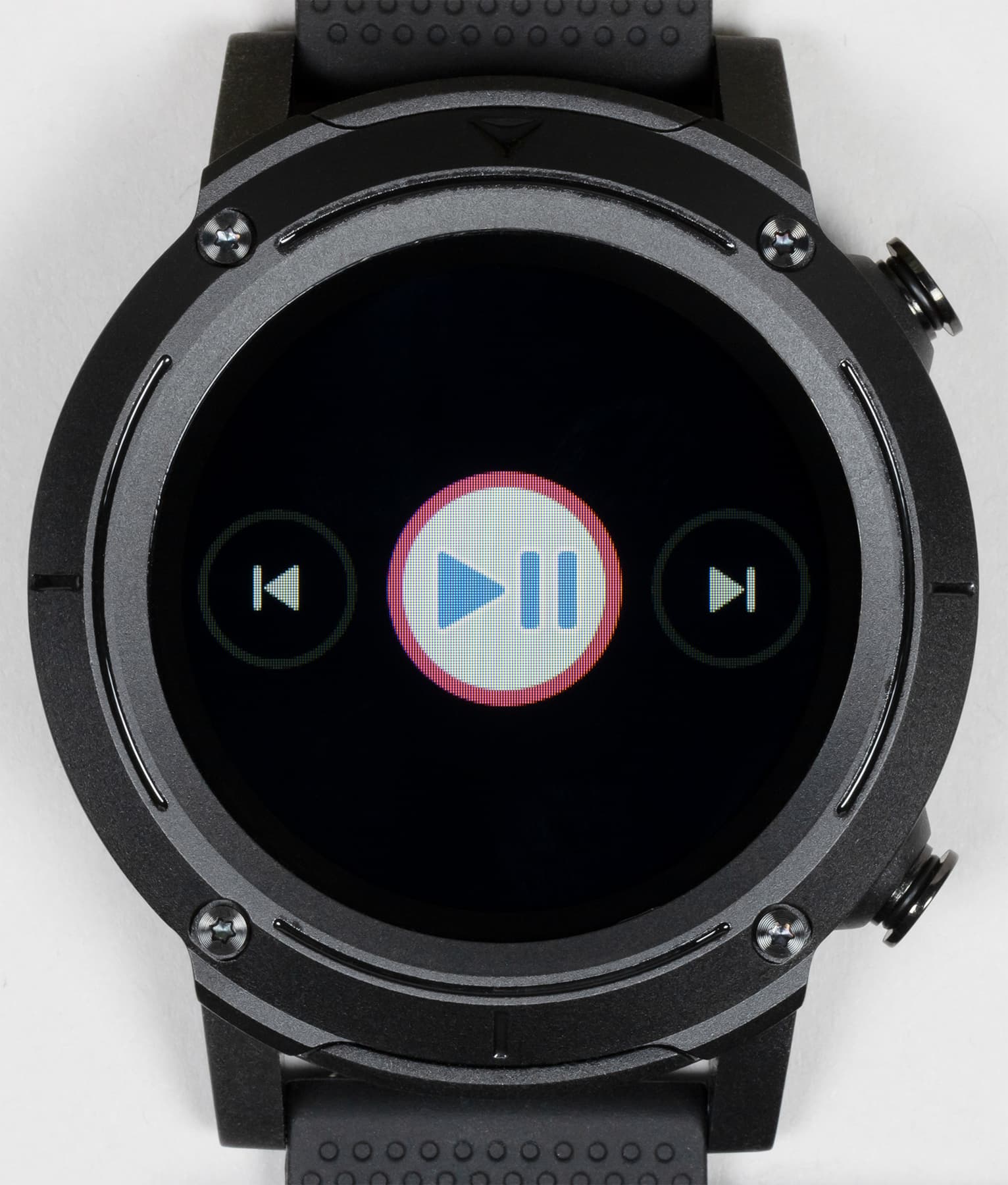 Внешний вид новых часов явно решен в духе брутальных спортивных моделей. Это огромный массивный корпус с металлической окантовкой вокруг дисплея, незамаскированными винтами и двумя физическими кнопками с правой стороны.