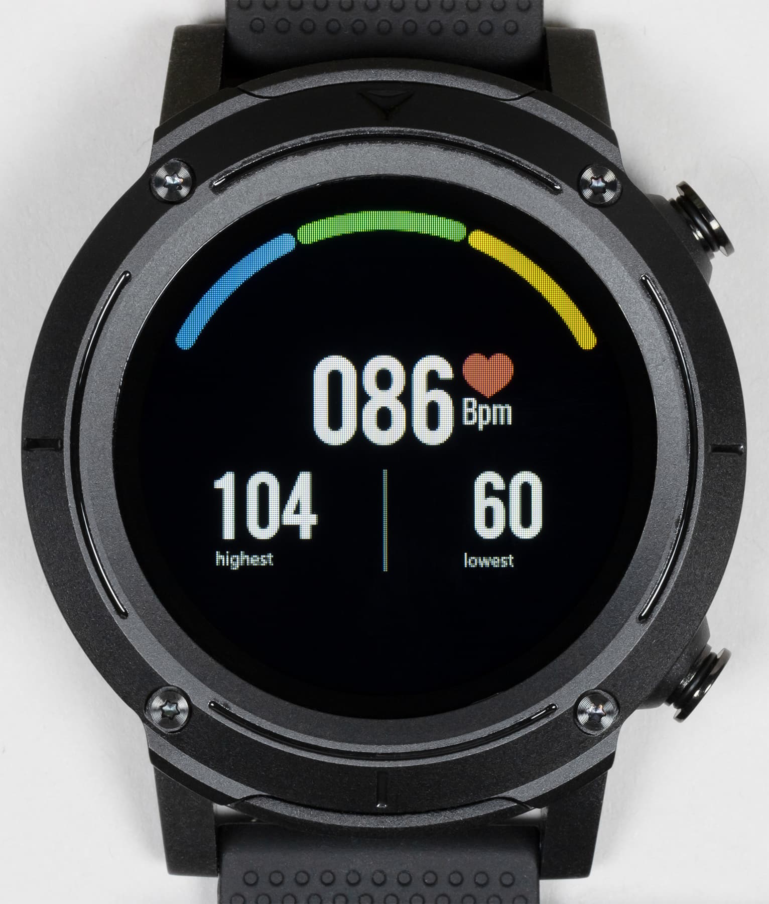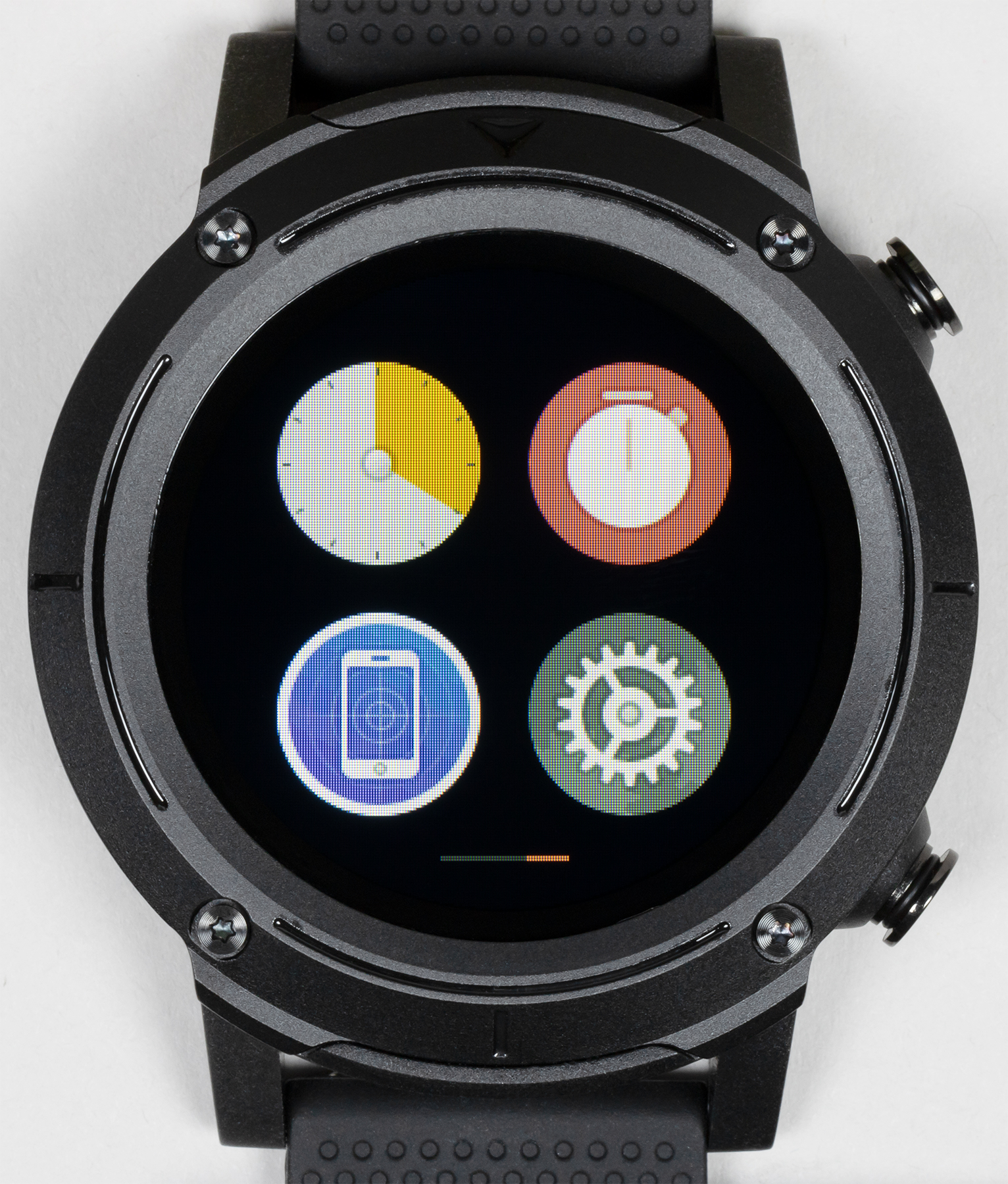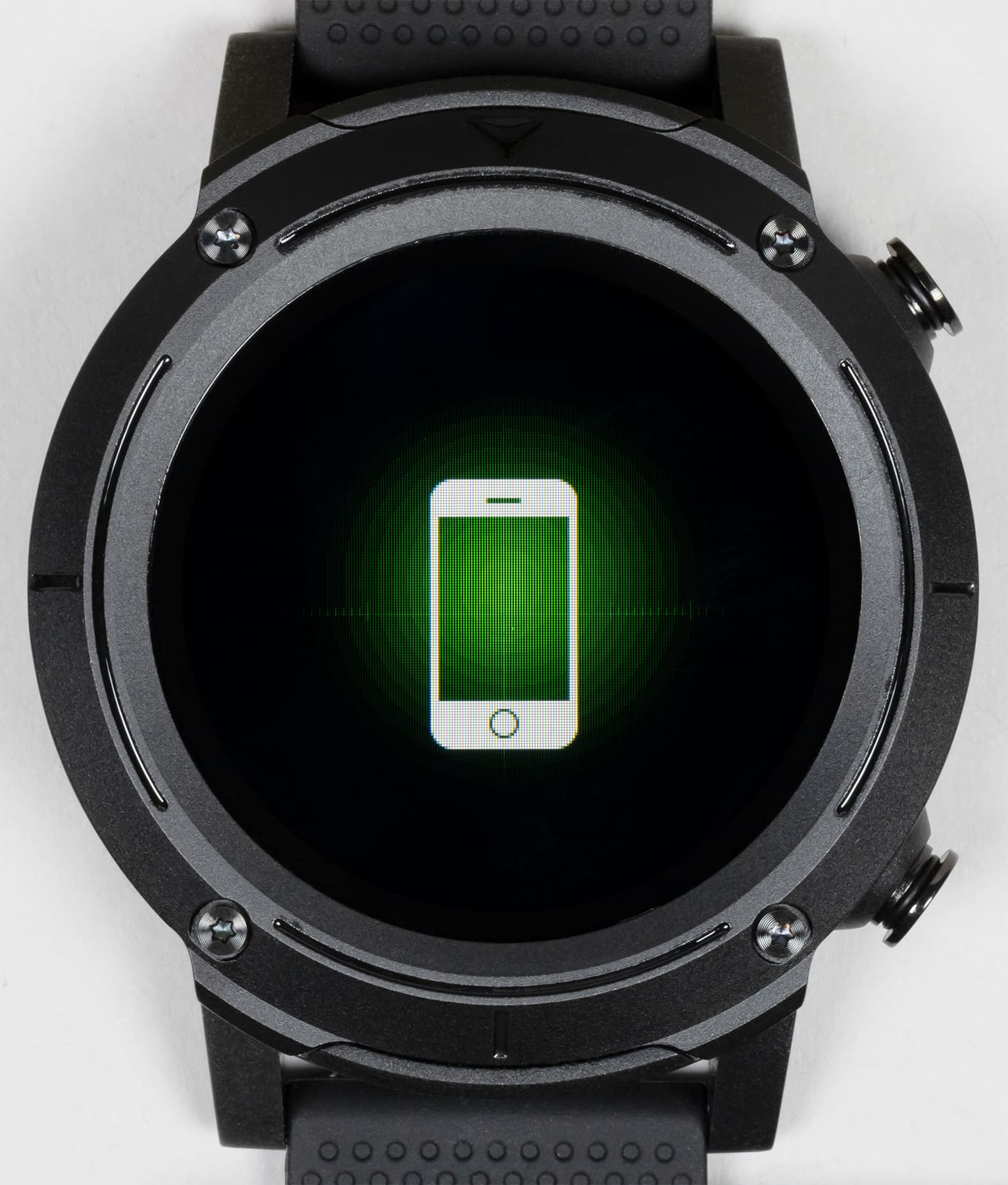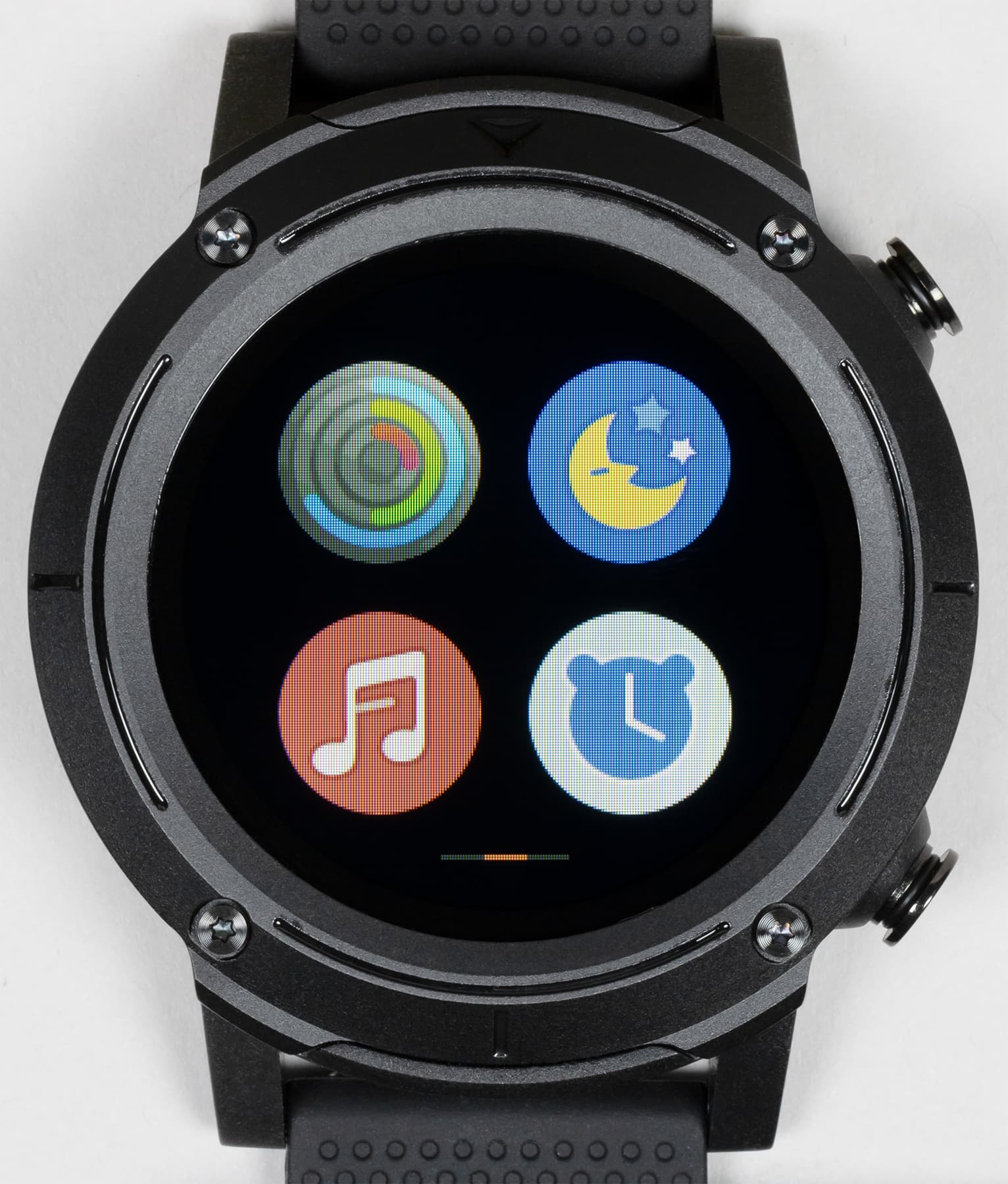 Внешний вид новых часов явно решен в духе брутальных спортивных моделей. Это огромный массивный корпус с металлической окантовкой вокруг дисплея, незамаскированными винтами и двумя физическими кнопками с правой стороны.