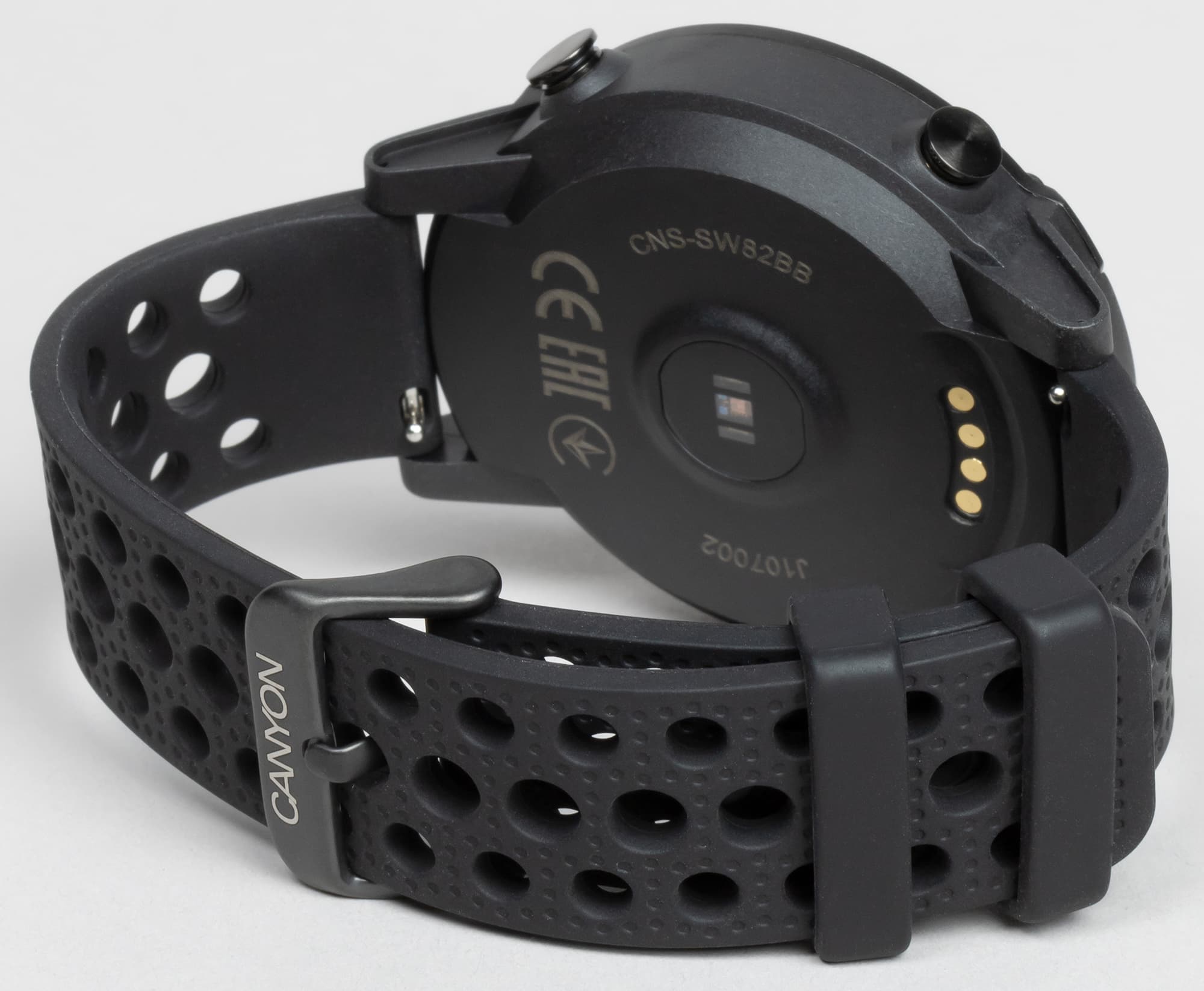 Помимо самого корпуса в глаза бросается и ремешок: он выполнен из силикона и имеет множество отверстий разного размера — сделано это для того, чтобы рука меньше потела, а часы сидели при этом максимально удобно. К слову, ремешки с похожим расположением отверстий выпускает Nike для Apple Watch. Ремешок стандартной ширины 20 мм и стандартного же крепления на металлических спицах, так что вполне можно приобрести и альтернативные варианты.