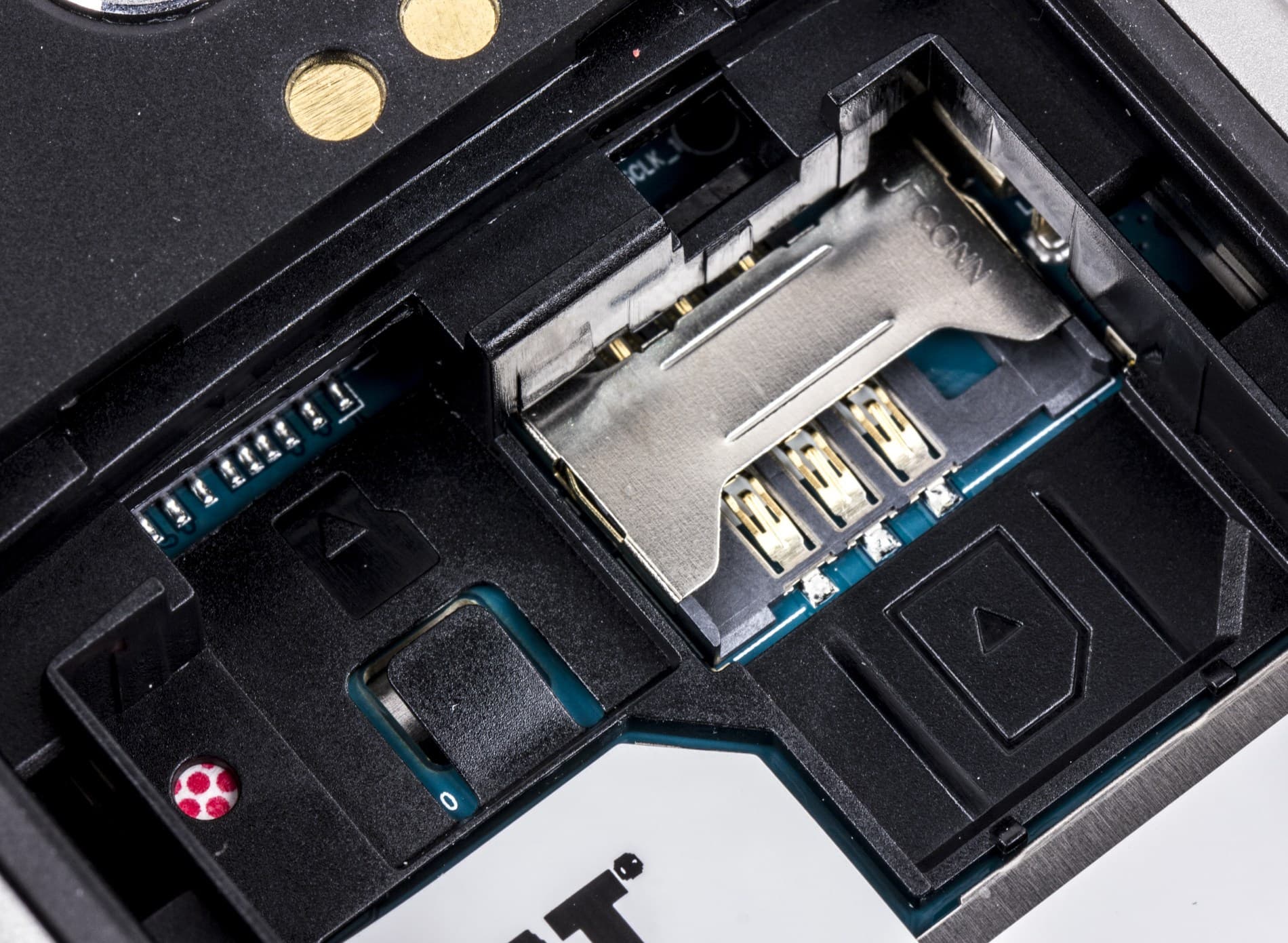 Под крышкой размещается батарея (1150 мА·ч, 3,7 В), а под батареей — карточки. Справа плотно устанавливается Mini-SIM, а слева microSD, причем карту памяти для надежности фиксирует снизу пластиковый язычок.