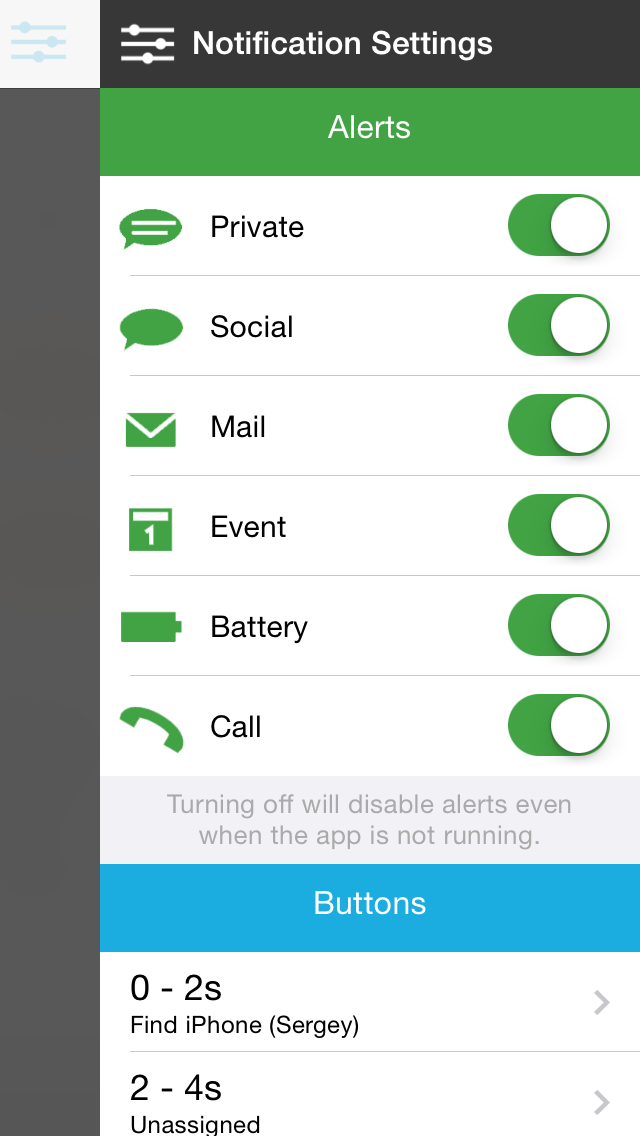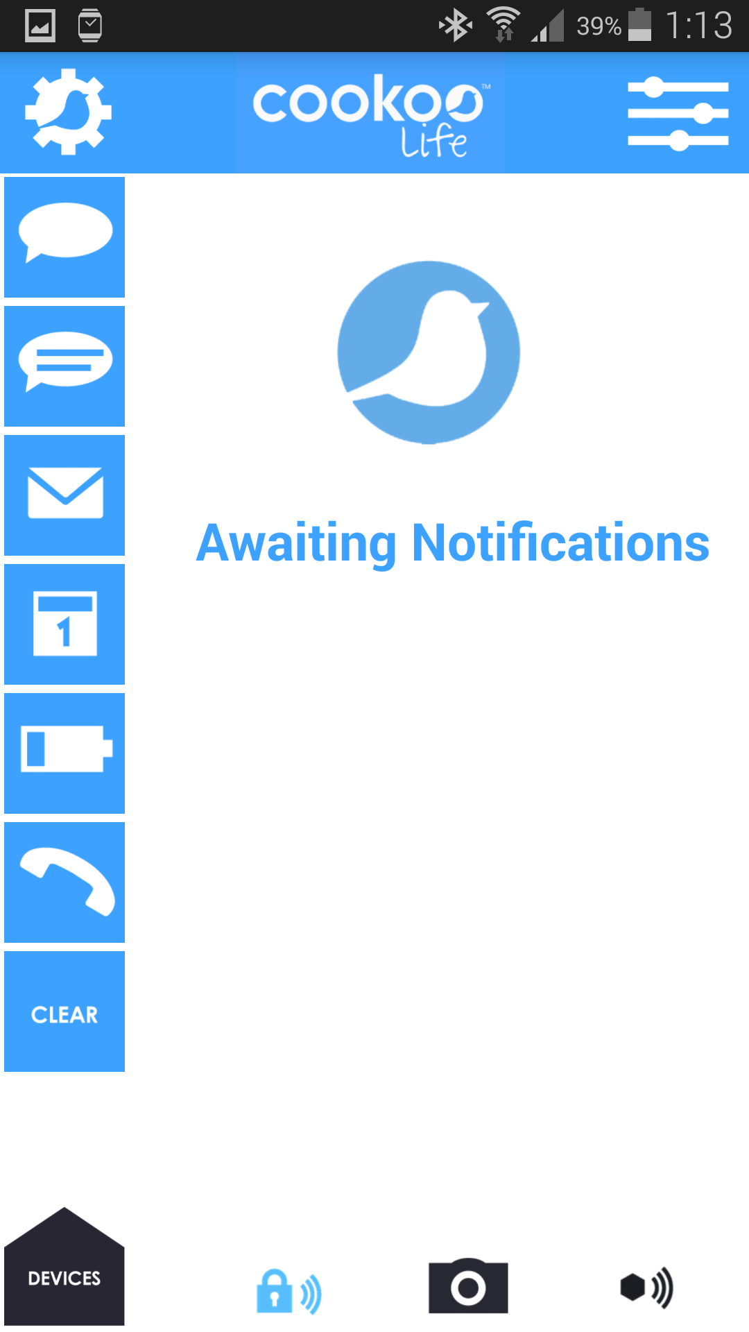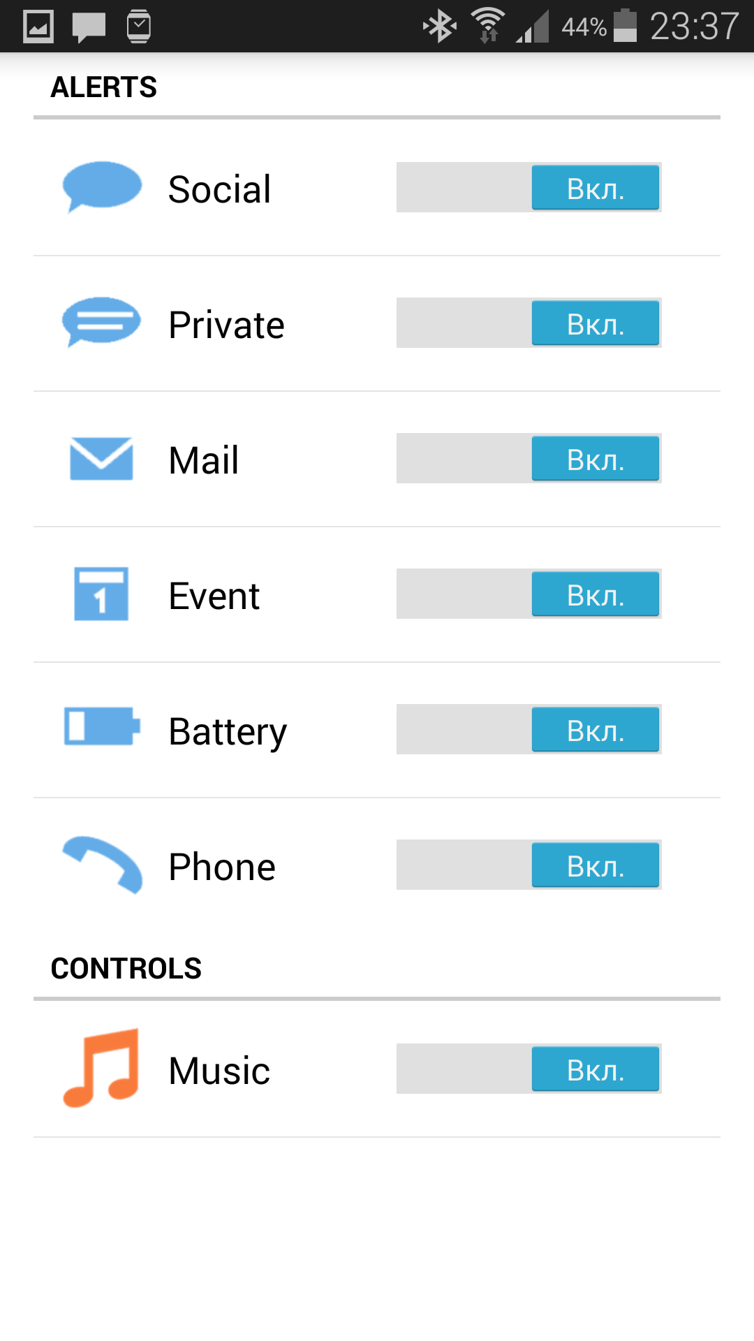 Кликнув на домик, мы можем нажать Connect (если часы пока еще не подключены) и Disconnect (если часы подключены). Нажав на круглую кнопку внизу, мы попадаем в меню уведомлений. Здесь отображаются приходившие на часы уведомления (спрашивается: зачем, если эти уведомления и так есть на смартфоне?). В правом верхнем углу — кнопка настроек уведомлений, где мы можем выбрать, какого типа уведомления хотим получать.