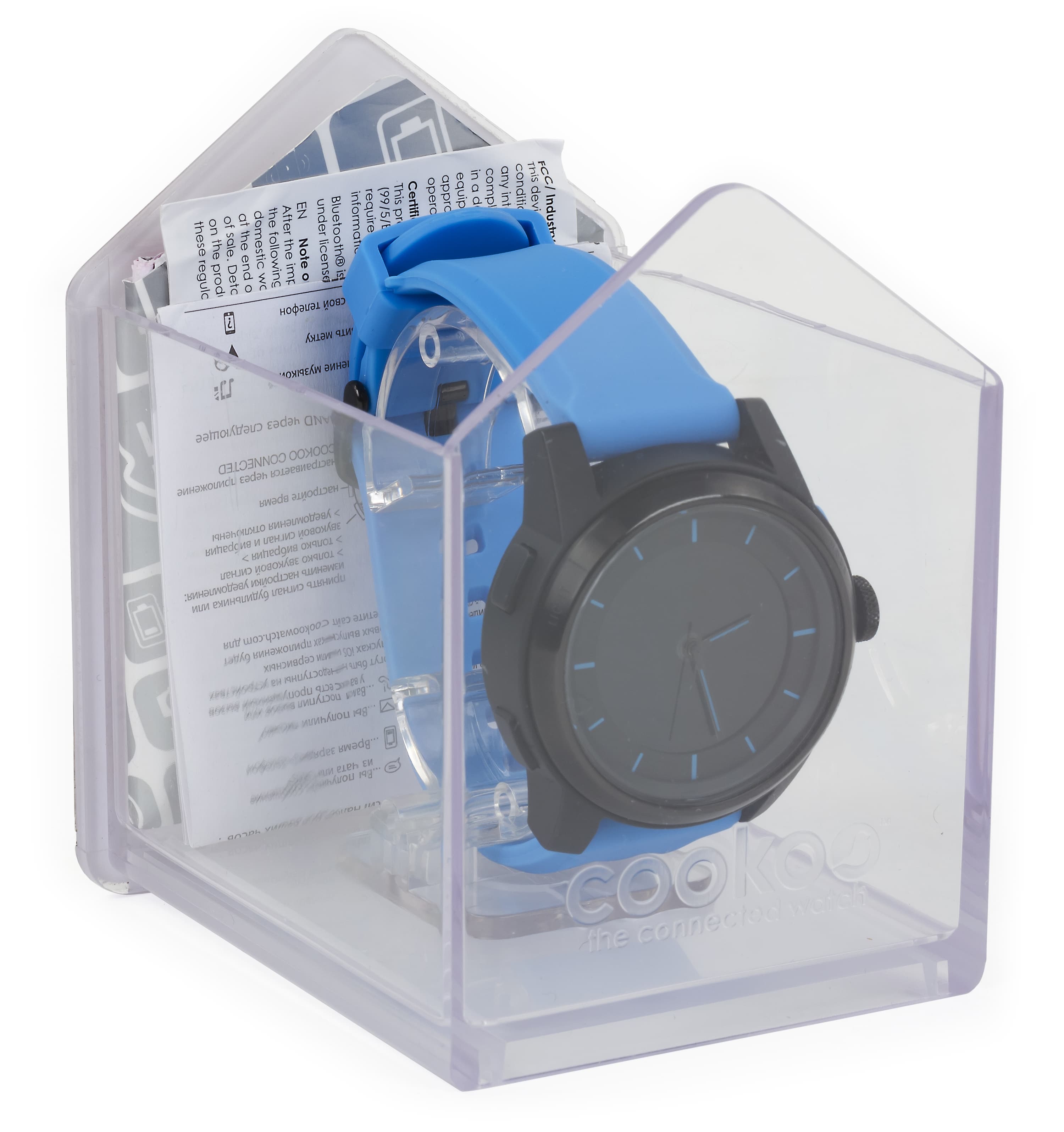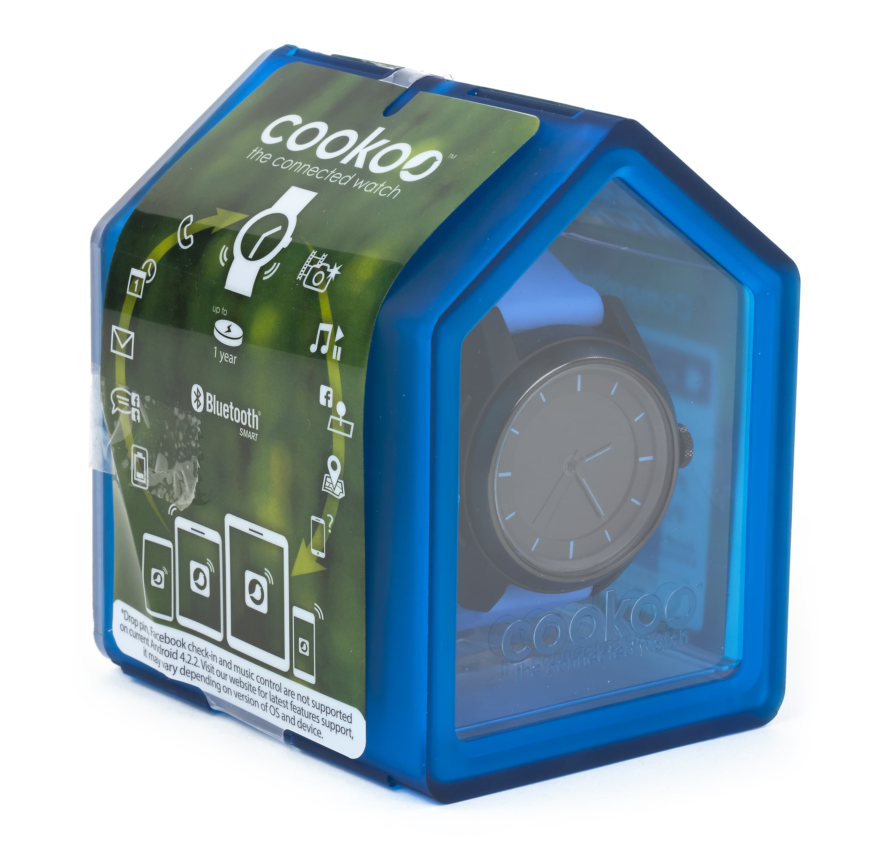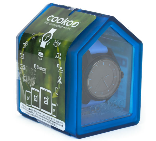 Часы поставляются в коробке, по форме напоминающей настенные часы с кукушкой — таким образом обыгрывается название устройства (Cookoo, то есть кукушка). В качестве основного материала коробки используется прозрачный твердый пластик.
