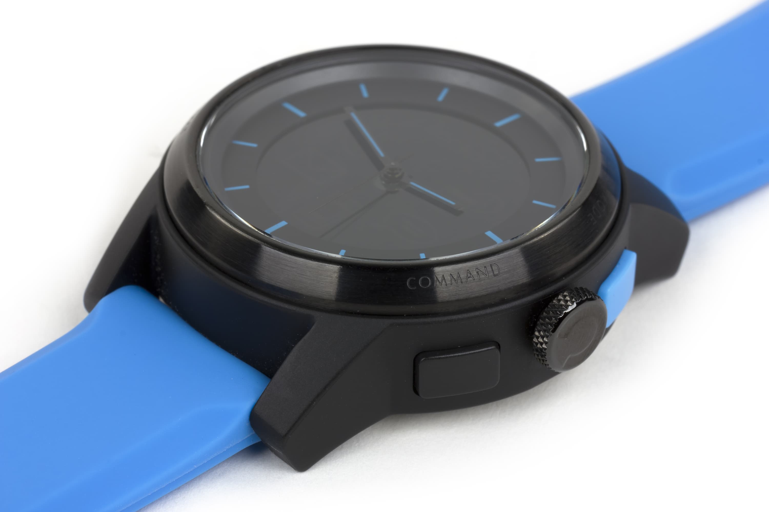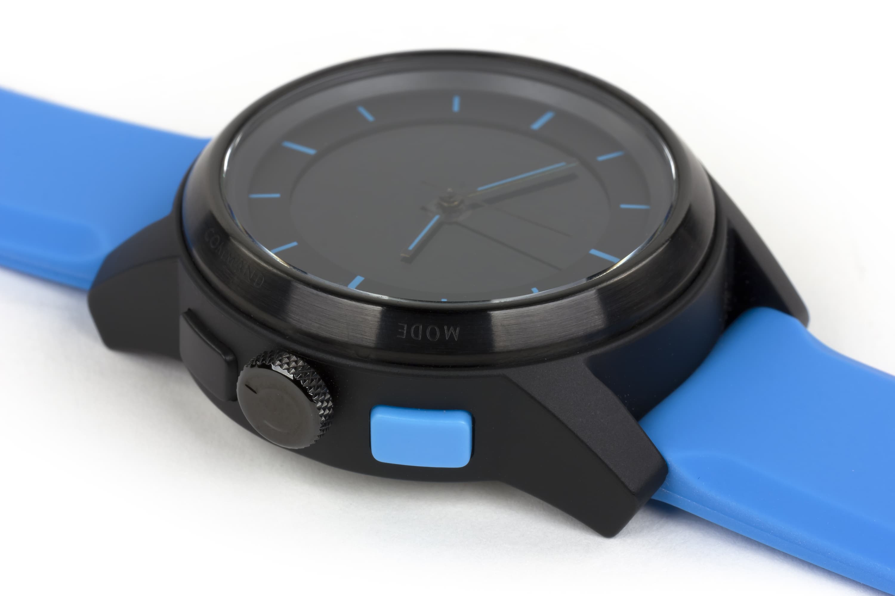 Существуют разные расцветки: на сайте производителя доступны для заказа голубой, белый, черный, розовый и светло-зеленый варианты (последний имеет пометку Limited Edition и продается за двойную цену). Интересно, что и на черном, и на белом вариантах есть голубая кнопка (на голубом ее наличие вполне понятно). На розовом варианте эта кнопка розовая, а на зеленом — зеленая. С одной стороны, наличие такого цветового акцента на черной и белой версиях кажется интересным решением. Но с другой стороны, мне сложно представить часы с веселенькой ярко-голубой кнопкой под костюмом или белой сорочкой.