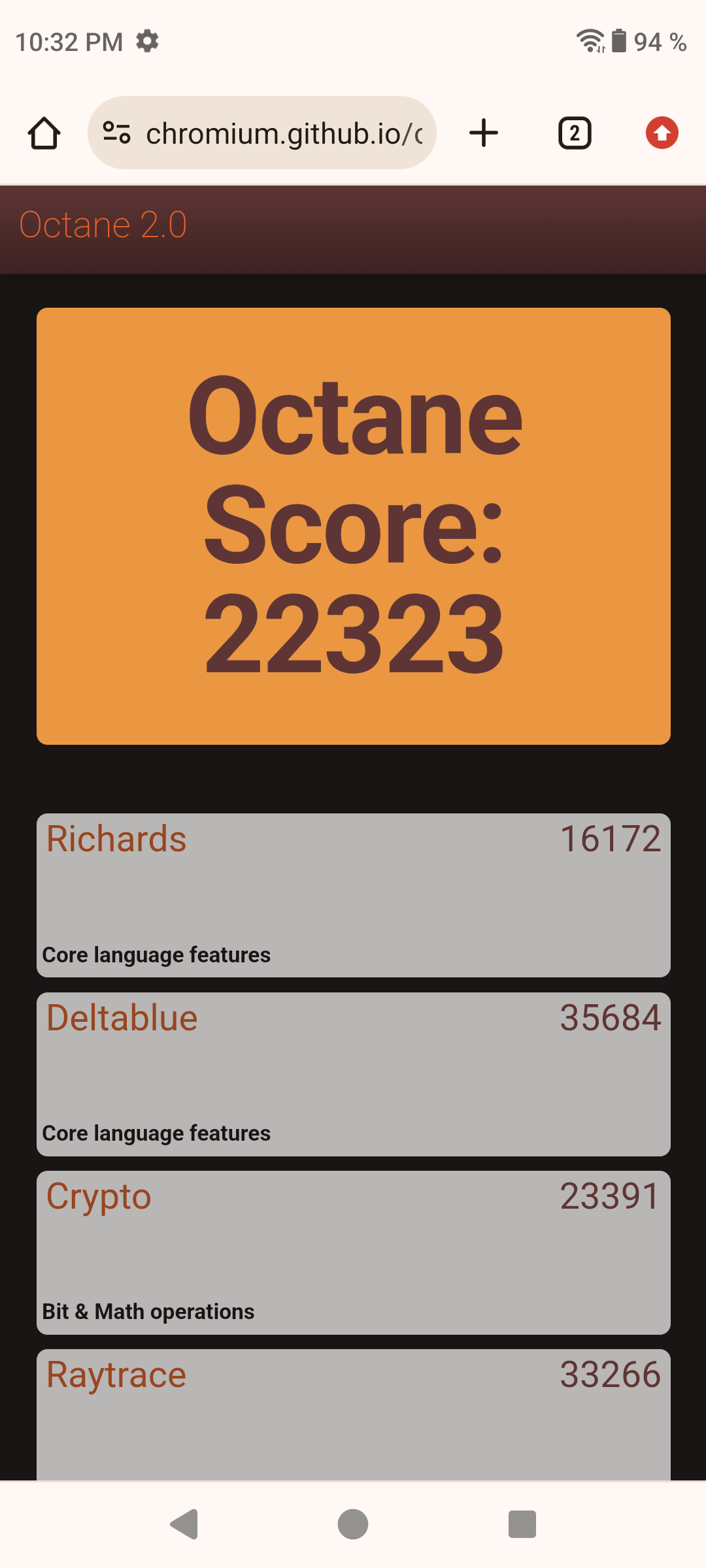 | Google Octane 2 (больше — лучше) | 22323 | 24923 | 29390 | 30529 | 39276 |