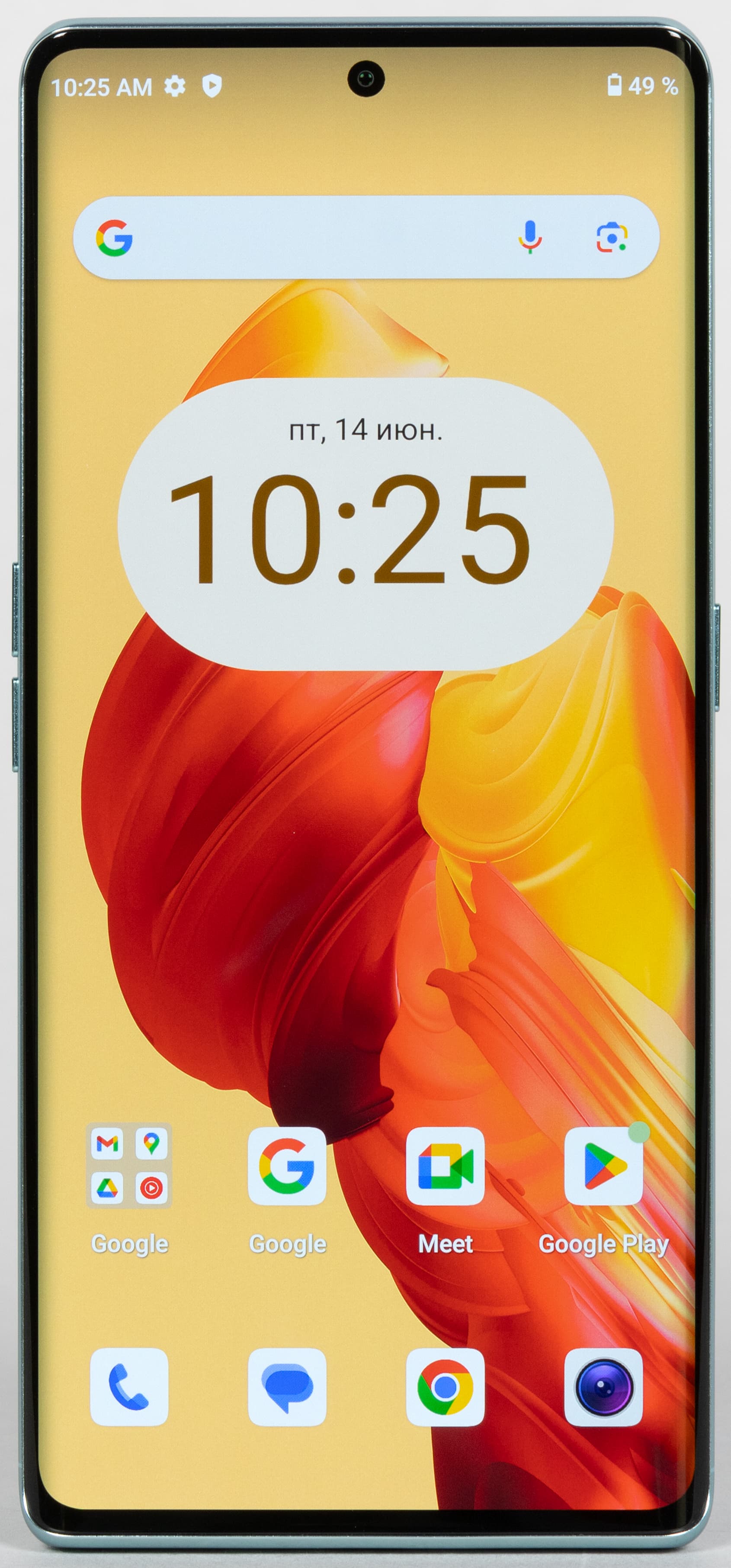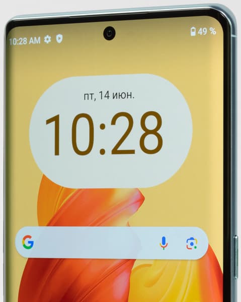 Сканер отпечатка пальца встроен под стекло экрана. Это неудобно при манипуляциях одной рукой, ему, конечно, место на боку в кнопке питания и блокировки. Оптический датчик срабатывает в целом нормально, но не так быстро, как емкостный. Да и на мокрые пальцы он не реагирует. Вверху, по центру верхней кромки, в экран врезана одиночная камера для селфи.
