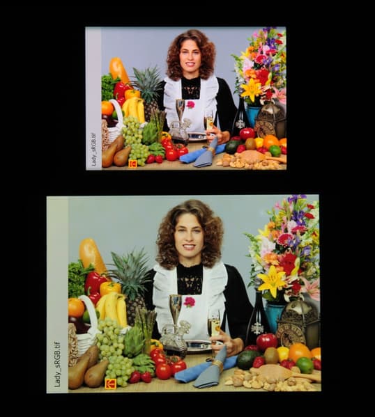 Цвета на экране смартфона перенасыщены (обратите внимание на помидоры, бананы, салфетку и оттенок лица), а цветовой баланс заметно отличается. Напомним, что фотография не может служить надежным источником сведений о качестве цветопередачи и приводится только для условной наглядной иллюстрации. В частности, выраженный красноватый оттенок белого и серого полей, присутствующий на фотографиях экрана смартфона, при перпендикулярном взгляде визуально отсутствует, что подтверждается аппаратными тестами с помощью спектрофотометра. Причина в том, что спектральная чувствительность матрицы фотоаппарата неточно совпадает с этой характеристикой человеческого зрения.