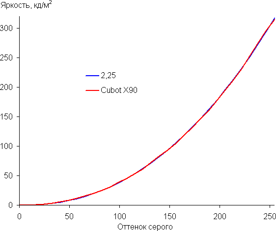 Напомним, что в случае OLED-экранов яркость фрагментов изображения динамично меняется в соответствии с характером выводимого изображения — слегка уменьшается для светлых в целом изображений. В итоге полученная зависимость яркости от оттенка (гамма-кривая), скорее всего, немного не соответствует гамма-кривой статичного изображения, так как измерения проводились при последовательном выводе оттенков серого почти на весь экран.