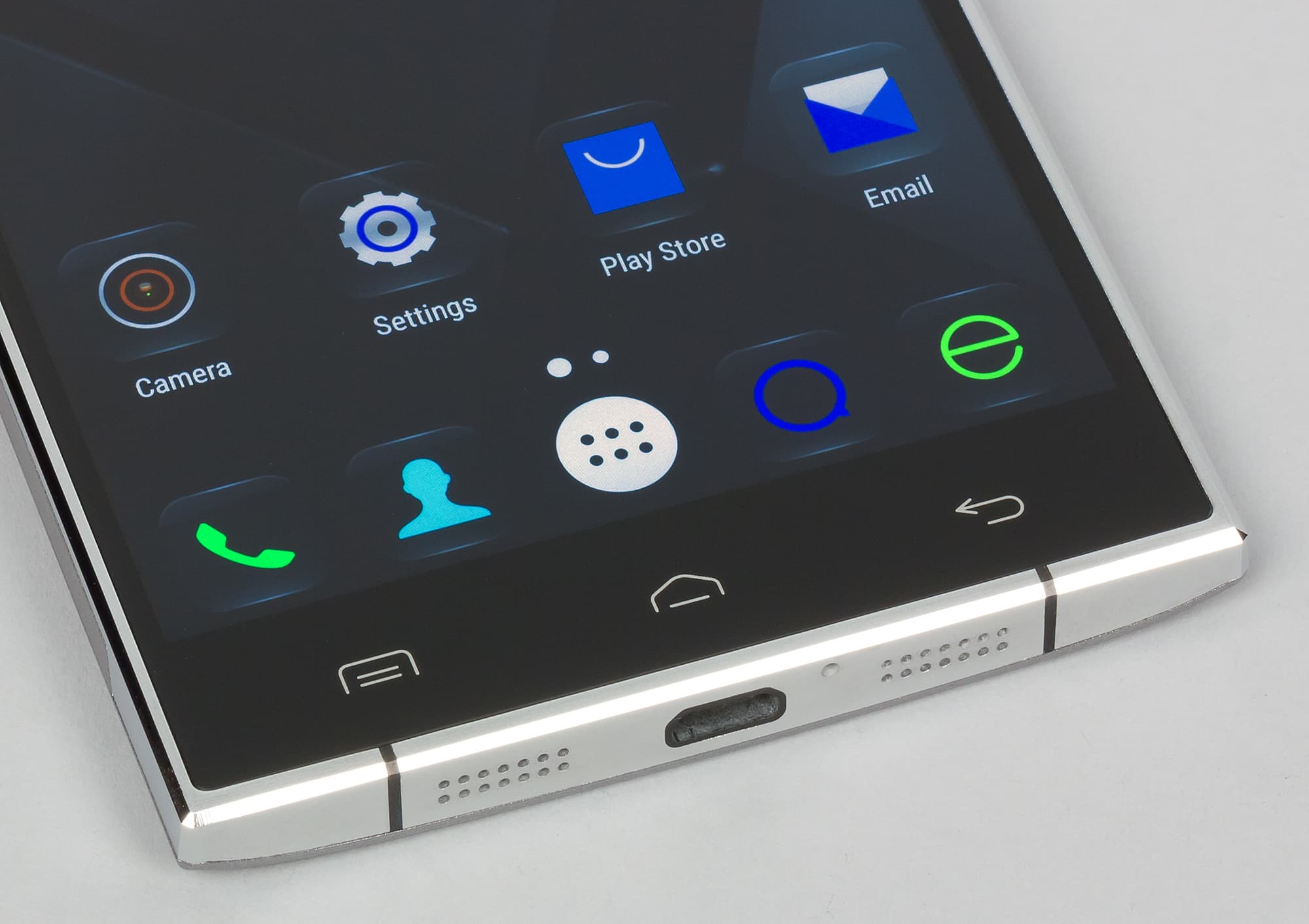 По обеим сторонам от разъема Micro-USB располагаются массивы мелких круглых отверстий, но, как водится, лишь через одну из этих стилизированных решеток выходит звук основного динамика, в то время как вторая является бутафорией (в этом легко убедиться, поочередно прикрывая решетки пальцем). Для разговорного микрофона вырезано отдельное круглое отверстие размером побольше. Отверстие второго, вспомогательного микрофона вынесено не на верхний торец, а на заднюю сторону смартфона, оно размещено рядом с модулем камеры.