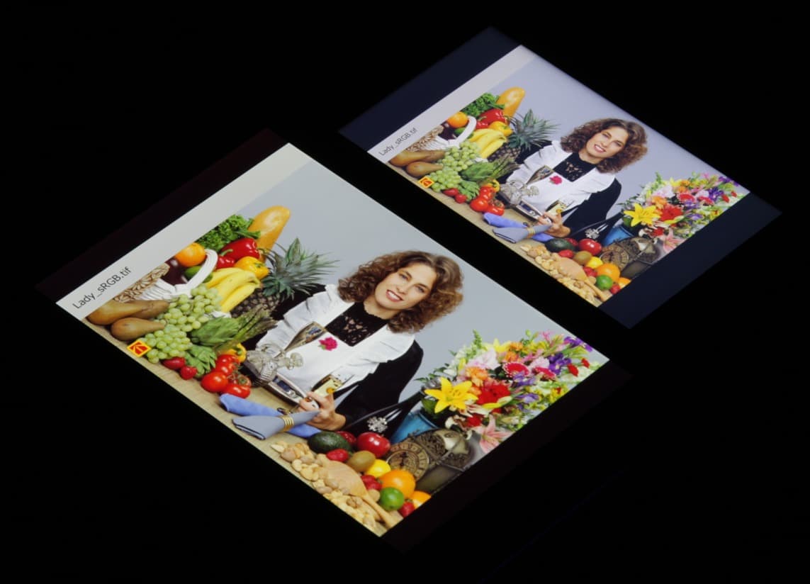 Однако отклонения координат первичных цветов от вершин треугольника sRGB небольшие, поэтому цвета имеют естественную насыщенность и оттенок. Баланс оттенков на шкале серого плохой, так как цветовая температура существенно выше стандартных 6500 К. Правда, отклонение от спектра абсолютно черного тела (ΔE) меньше 10, что для потребительского устройства считается приемлемым показателем. Однако при этом ΔE и цветовая температура сильно изменяются от оттенка к оттенку — это отрицательно сказывается на визуальной оценке цветового баланса. (Самые темные области шкалы серого можно не учитывать, так как там баланс цветов не имеет большого значения, да и погрешность измерений цветовых характеристик на низкой яркости большая.)