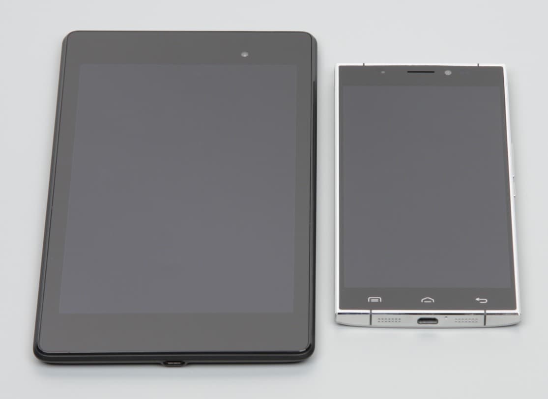 Лицевая поверхность экрана выполнена в виде стеклянной пластины с зеркально-гладкой поверхностью, устойчивой к появлению царапин. Судя по отражению объектов антибликовые свойства экрана не хуже, чем у экрана Google Nexus 7 (2013) (далее просто Nexus 7). Для наглядности приведем фотографию, на которой в выключенных экранах отражается белая поверхность (слева — Nexus 7, справа — Doogee F5, далее их можно различать по размеру):