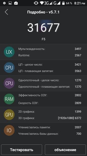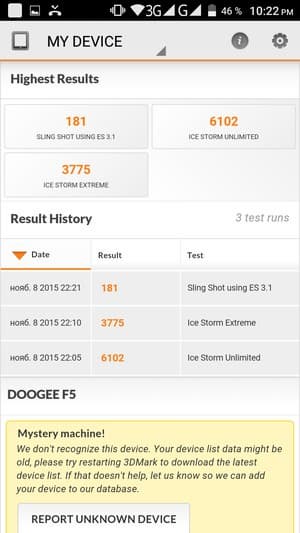 Несъемная аккумуляторная батарея, установленная в Doogee F5, имеет емкость в 2660 мА·ч, ничто не помешало герою обзора продемонстрировать достаточно приемлемый уровень автономности. Обошлось без рекордов, платформы MediaTek никогда не славились особой экономичностью, но при не слишком производительной платформе и достаточно емкой батарее длительность автономной работы смартфона Doogee F5 по современным меркам находится выше среднего уровня.