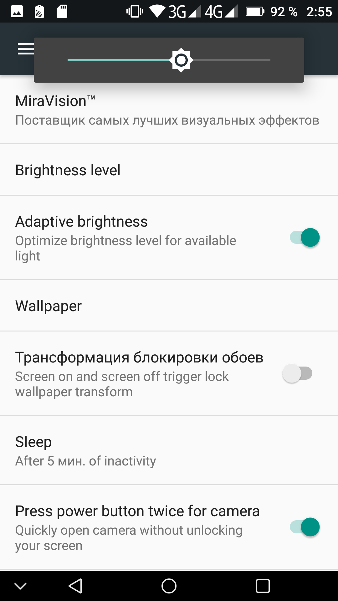 Есть возможность использовать автоматическую подстройку яркости, основанную на работе датчика внешнего освещения. Тесты мультитач диагностируют поддержку 10 одновременных касаний.