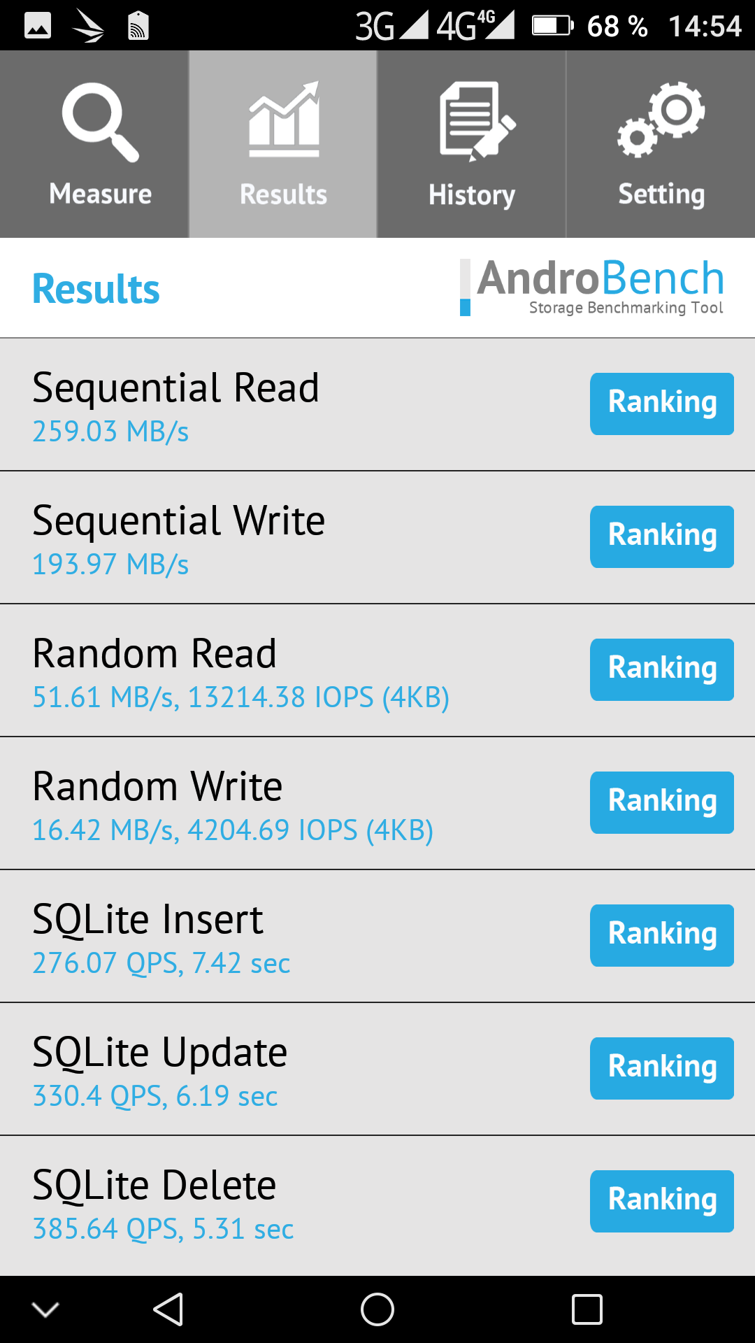 Результаты теста AndroBench на скорость работы с памятью: