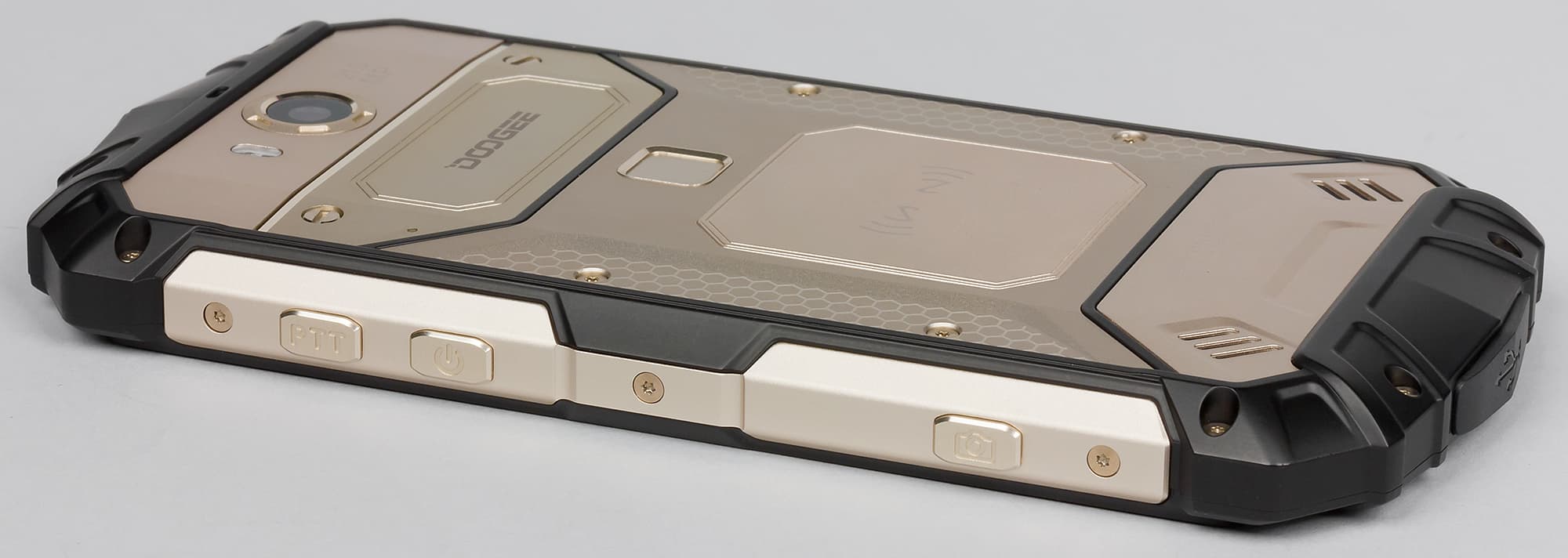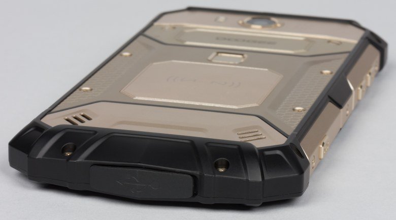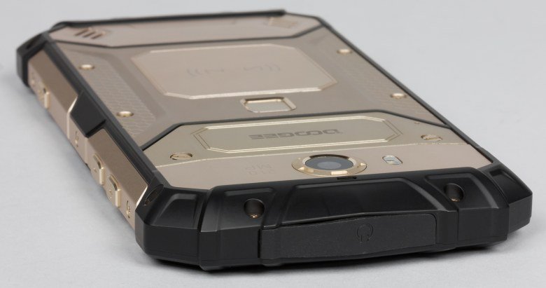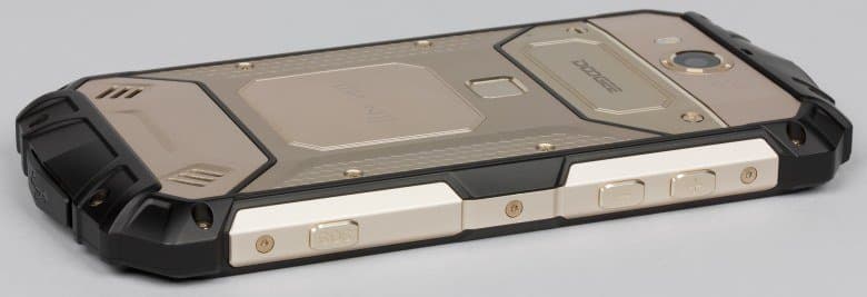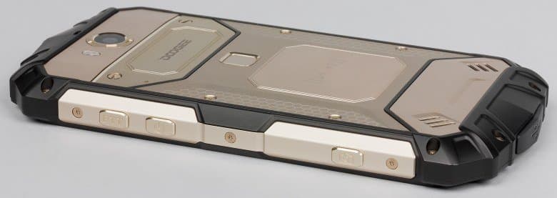 Любопытно, что там, где больше всего нужна прорезиненная пластмасса, чтобы обхватывающая корпус за боковины и середину задней панели рука не скользила, как нарочно, прикрепили металлические накладки из матового твердого металла, а на торцах установили толстые прорезиненные накладки. Понятно, что они должны защищать от ударов при падениях, но металл в руке скользит, и смартфон с такой большой массой так и норовит выскользнуть из пальцев. В этом плане практичным корпус Doogee S60 назвать никак нельзя: боковины у таких устройств не должны быть скользкими.