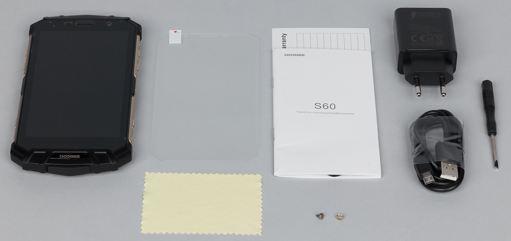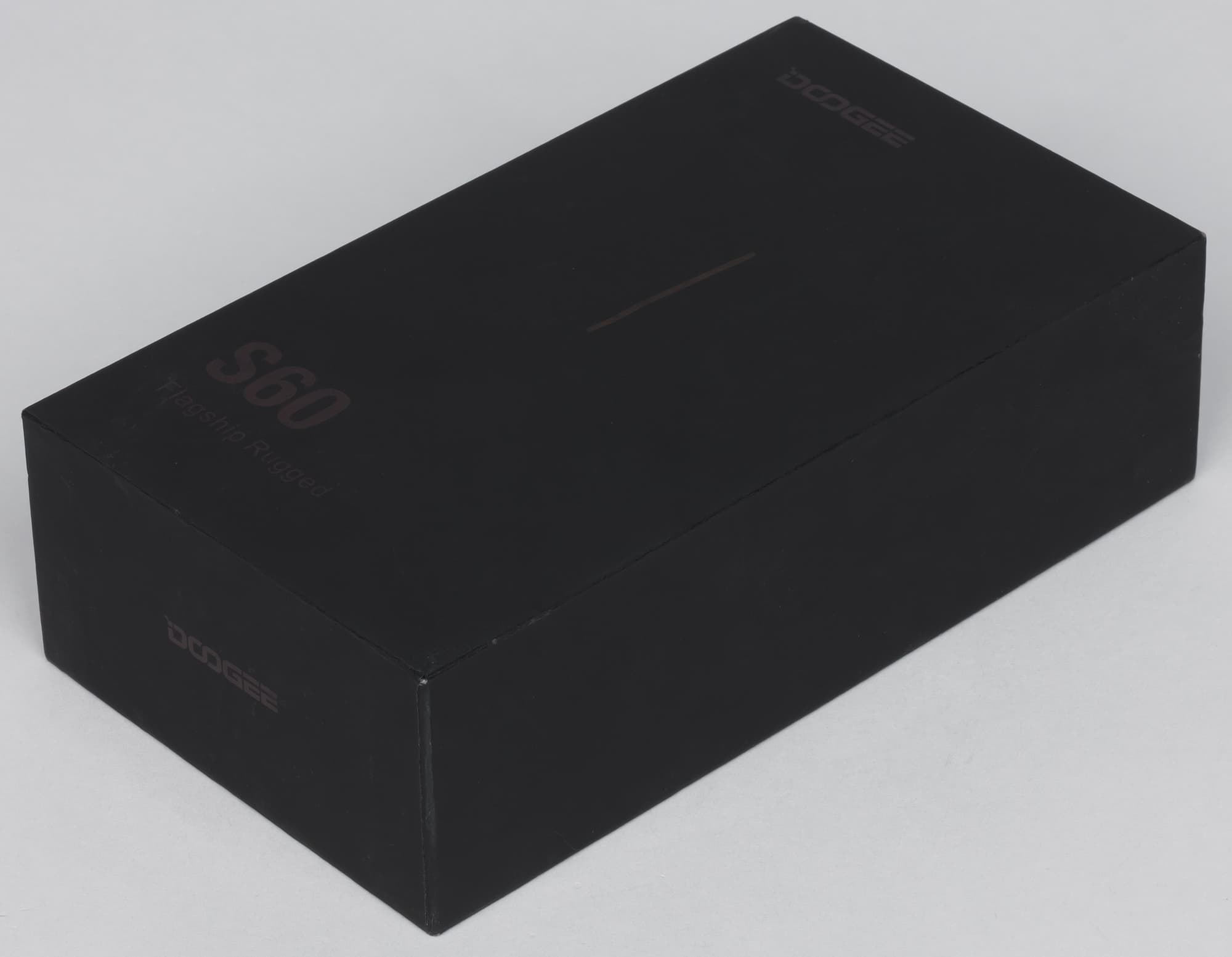 Doogee S60 поставляется в продажу в очень крупной коробке из черного бархатистого картона с золотистыми надписями.