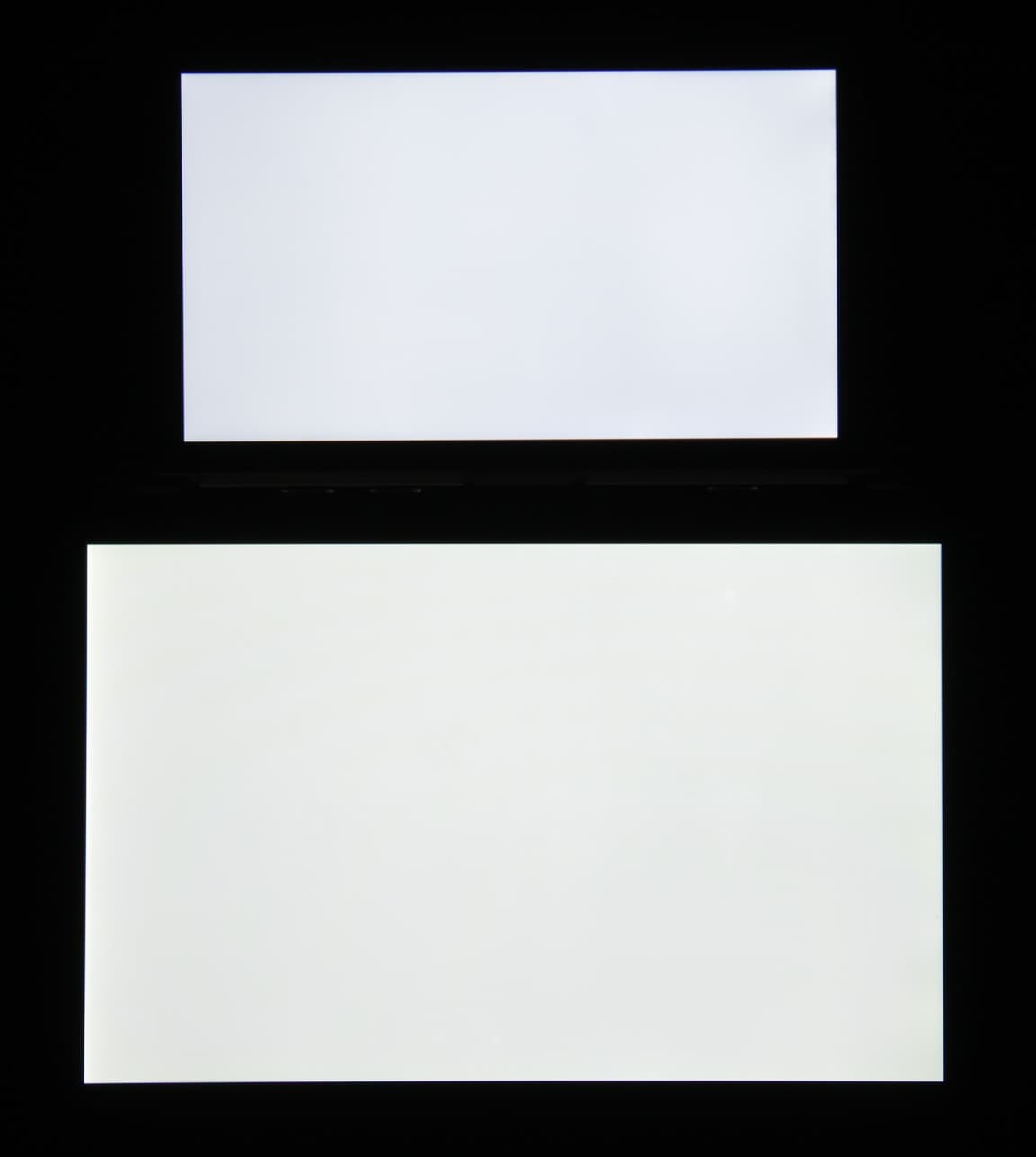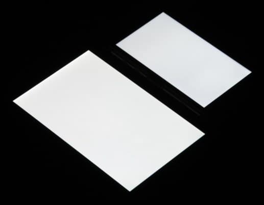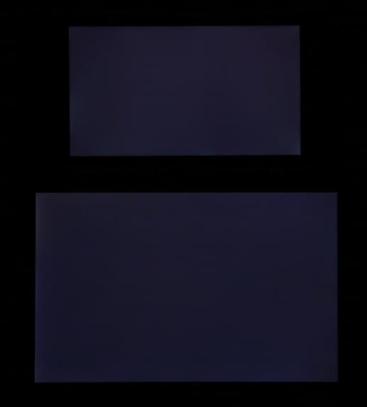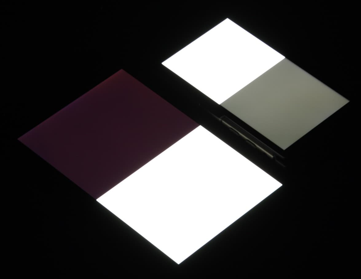 Яркость под углом у экранов уменьшилась (как минимум в 5 раз, исходя из разницы в выдержке), но у Doogee S60 снижение яркости чуть больше. Черное поле при отклонении по диагонали сильно высветляется и остается условно серым или приобретает фиолетовый оттенок. Фотографии ниже это демонстрируют (яркость белых участков в перпендикулярном плоскости экранов направлении одинаковая!):