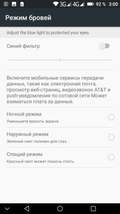 При ручном управлении яркостью и при выводе белого поля во весь экран максимальное значение яркости составило около 620 кд/м², минимальное — 24 кд/м². Максимальная яркость очень высокая, и, учитывая хорошие антибликовые свойства, читаемость экрана даже в солнечный день вне помещения должна быть на приличном уровне. В полной темноте яркость можно понизить до комфортного значения. В наличии автоматическая регулировка яркости по датчику освещенности (он находится слева от прорези фронтального громкоговорителя). В автоматическом режиме при изменении внешних условий освещенности яркость экрана как повышается, так и понижается. Работа этой функции зависит от положения ползунка регулировки яркости. Если он на 100%, то в полной темноте функция автояркости уменьшает яркость до 450 кд/м² (очень ярко), если на 50% — до 230 кд/м² (тоже слишком ярко), а если на 0% — до 25 кд/м² (нормально). При этом независимо от регулировки яркости в условиях освещенного искусственным светом офиса (около 550 лк) и в очень ярком окружении (соответствует освещению ясным днем вне помещения, но без прямого солнечного света — 20000 лк или немного больше) яркость повышается до 620 кд/м² (что для офиса высоковато). Получается, что функция автоподстройки яркости работает неадекватно. На любом уровне яркости значимая модуляция подсветки отсутствует, поэтому нет и никакого мерцания экрана.