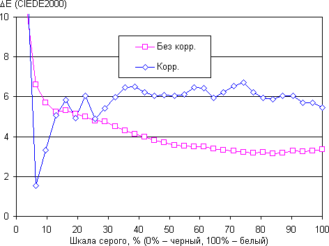 На графиках выше кривые Без корр. соответствуют результатам без какой-либо коррекции цветового баланса, а кривые Корр. — данным, полученным после сдвига ползунка коррекции цветовой температуры в крайнее левое положение. Видно, что изменение баланса соответствует ожидаемому результату, так как цветовая температура приблизилась к стандартному значению, при этом значение ΔE возросло несущественно. Выполнять такую коррекцию имеет смысл.