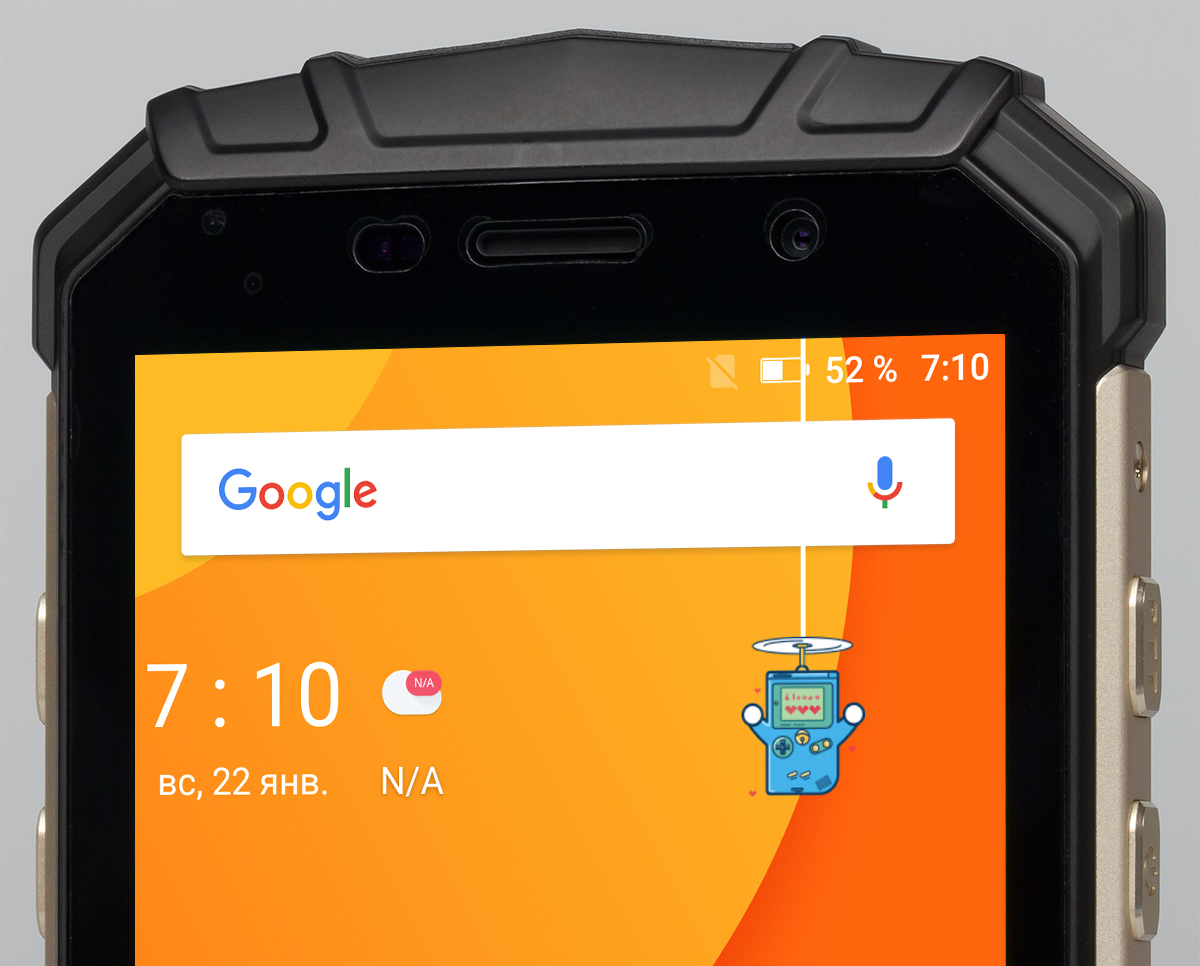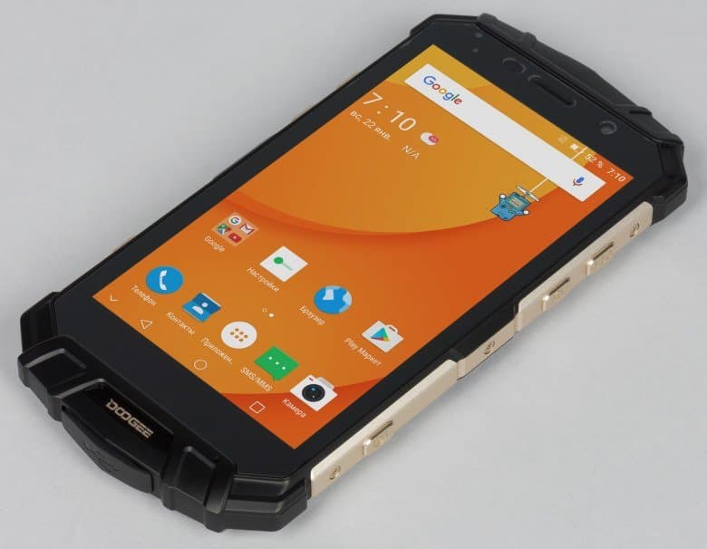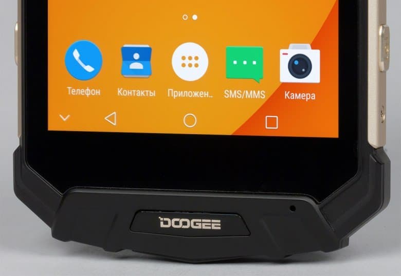 Doogee S60 оснащен дисплеем IPS, прикрытым плоским защитным стеклом без покатых краев. Это вполне логично, так как у плоского стекла меньше шансов задеть что-либо при падении, а со всех сторон оно защищено выступающим прорезиненным бортиком. Официально заявлено, что здесь используется Corning Gorilla Glass 5, хотя любые такие обещания китайских производителей всегда следует воспринимать с долей скептицизма.