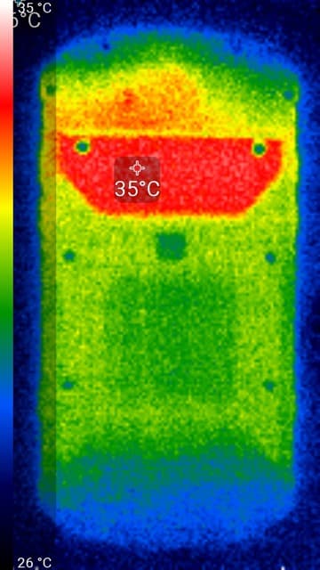 Нагрев больше локализован в верхней части аппарата, что, видимо, соответствует расположению микросхемы SoC. По данным теплокамеры, максимальный нагрев составил 35 градусов (при температуре окружающего воздуха в 24 градуса), это относительно немного.