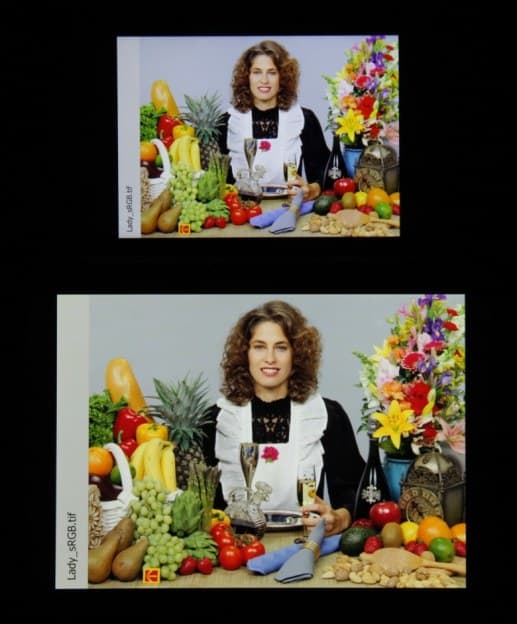 В итоге цвета имеют естественную насыщенность и оттенок. Баланс оттенков на шкале серого плохой, так как цветовая температура очень сильно выше стандартных 6500 К, но хотя бы отклонение от спектра абсолютно черного тела (ΔE) ниже 10, что для потребительского устройства считается приемлемым показателем. При этом оба параметра мало изменяются от оттенка к оттенку — это положительно сказывается на визуальной оценке цветового баланса. (Самые темные области шкалы серого можно не учитывать, так как там баланс цветов не имеет большого значения, да и погрешность измерений цветовых характеристик на низкой яркости большая.)