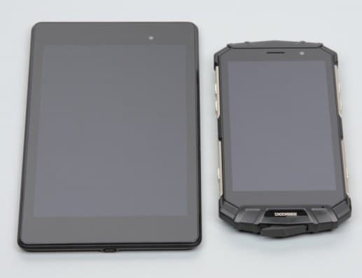 Лицевая поверхность экрана выполнена в виде стеклянной пластины с зеркально-гладкой поверхностью, устойчивой к появлению царапин. Судя по отражению объектов, антибликовые свойства экрана примерно как у экрана Google Nexus 7 (2013) (далее просто Nexus 7). Для наглядности приведем фотографию, на которой в выключенных экранах отражается белая поверхность (слева — Nexus 7, справа — Doogee S60, далее их можно различать по размеру):