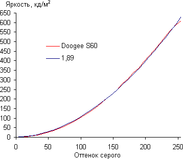 Контрастность (примерно в центре экрана) нормальная — порядка 900:1. Время отклика при переходе черный-белый-черный равно 19 мс (10 мс вкл. + 9 мс выкл.). Переход между полутонами серого 25% и 75% (по численному значению цвета) и обратно в сумме занимает 28 мс. Построенная по 32 точкам с равным интервалом по численному значению оттенка серого гамма-кривая не выявила завала ни в светах, ни в тенях. Показатель аппроксимирующей степенной функции равен 1,89, что ниже стандартного значения 2,2. При этом реальная гамма-кривая немного отклоняется от степенной зависимости:
