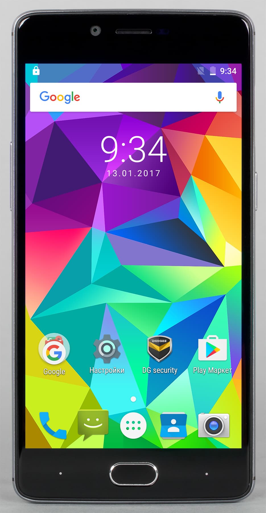 Как и у большинства современных смартфонов, дизайн у Doogee Shoot 1 самый обыкновенный, ничем особо не примечательный, но и отторжения не вызывающий, все обыденно, спокойно, можно даже сказать, строго. Это не обтекаемый со всех сторон «обмылок», тут имеются явно очерченные грани и торцы, есть выраженные переходы между лицевой и тыльной панелями и боковинами, угловые части в плане закруглены довольно мало.