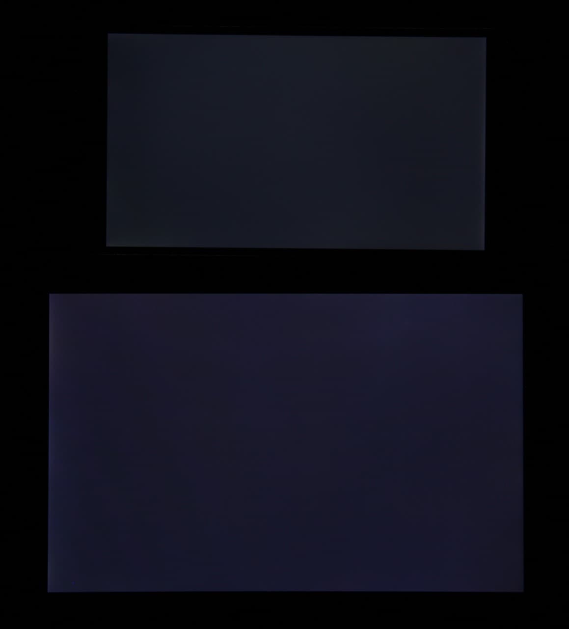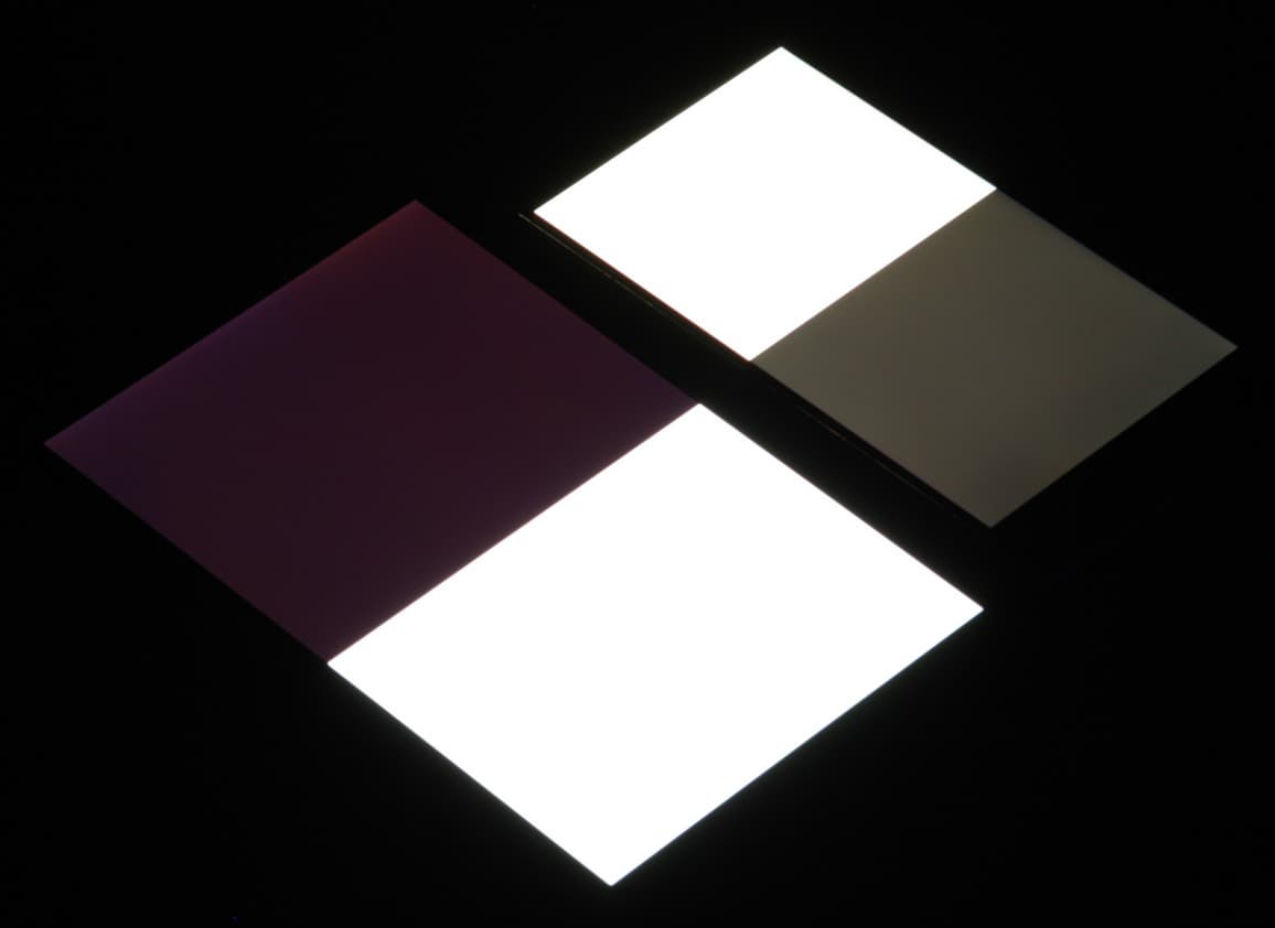 Яркость под углом у экранов уменьшилась (как минимум в 5 раз, исходя из разницы в выдержке), но у Doogee Shoot 1 экран все же светлее. Черное поле при отклонении по диагонали высветляется сильно, но остается условно нейтрально-серым. Фотографии ниже это демонстрируют (яркость белых участков в перпендикулярном плоскости экранов направлении одинаковая!):